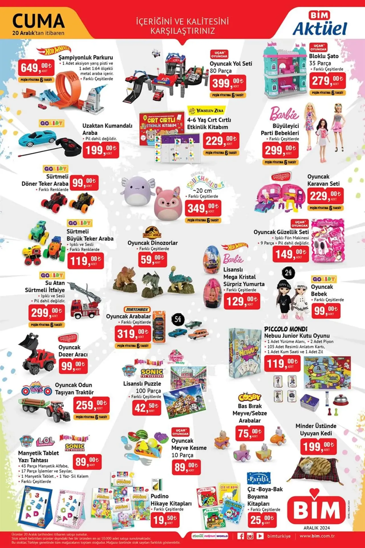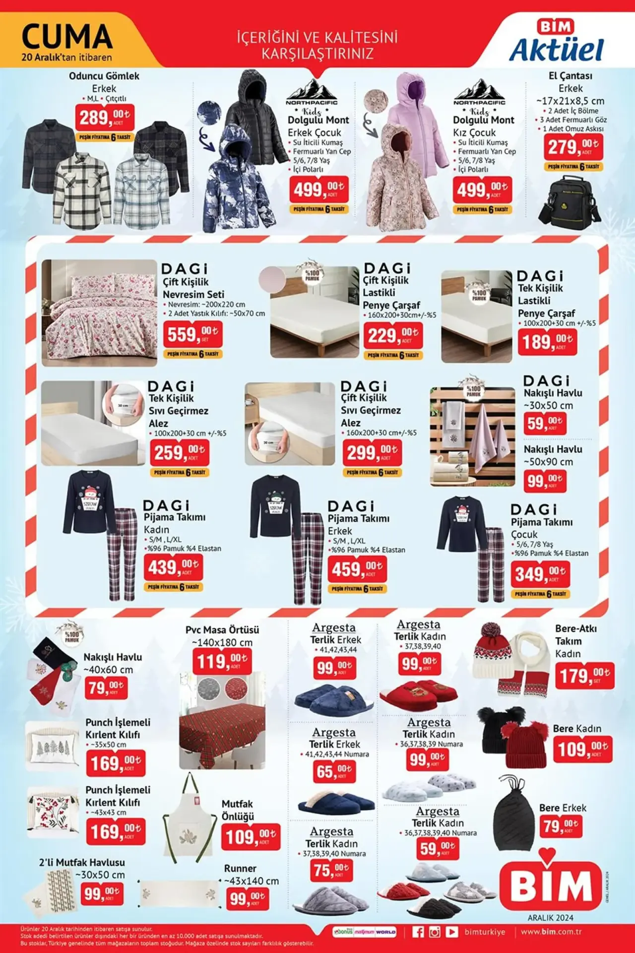 BİM’in bu hafta yayınladığı katalogda yer alan ürünler 20 Aralık Cuma günü itibarıyla mağazalarda olacak. Katalogda; mutfak önlüğü, nakışlı havlu, pijama takımları, sıvı geçirmez alezler, çift kişilik nevresim setleri, manyetik tablet yazı tahtası, lisanslı puzzle ve oyuncak arabalar gibi pek çok ürün dikkat çekiyor.
