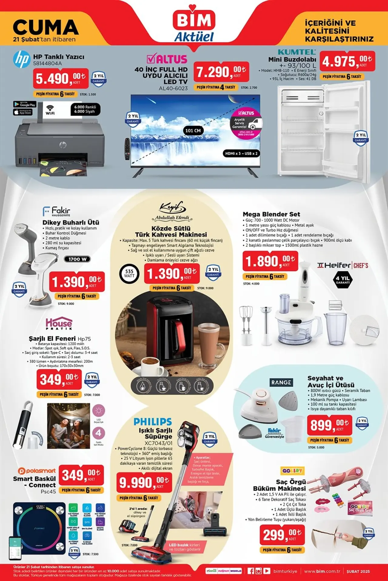 BİM'in 21 Şubat katalogunda evde kullanabileceğiniz pek çok elektrikli ürün yer alıyor. Fakir Dikey Buharlı Ütü 1.390 TL ve Abdullah Efendi Keyif Közde Sütlü Türk Kahvesi Makinesi 1.390 TL gibi kaliteli ürünler, evdeki işlerinizi kolaylaştıracak. Ayrıca Heve Mega Blender Seti 1.890 TL ile mutfakta geçirdiğiniz zaman daha verimli hale gelecek.