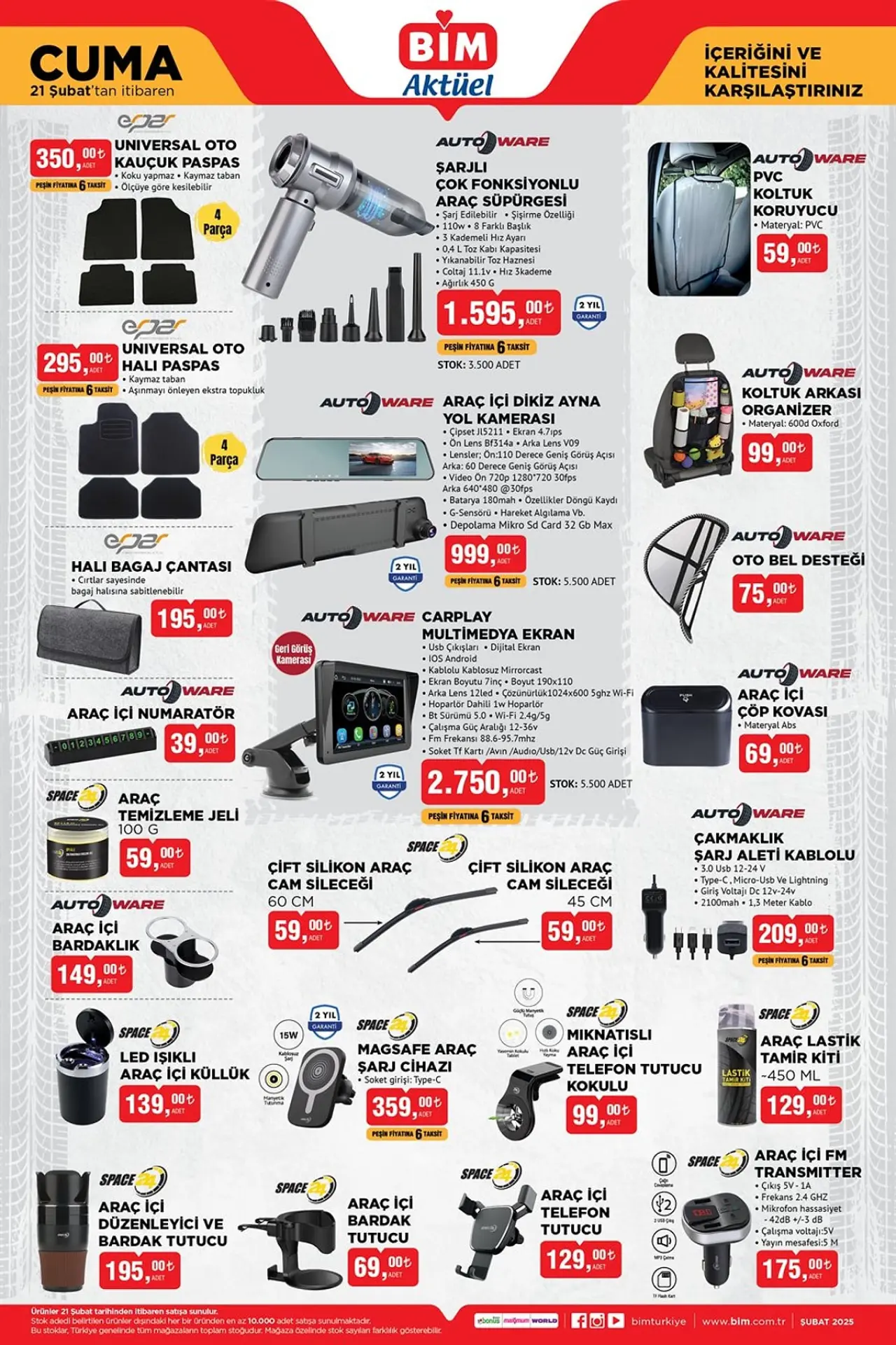 BİM kataloğunda araç sahipleri için de pek çok seçenek bulunuyor. Universal Kauçuk Paspas 350 TL, Universal Oto Halı Paspas 295 TL, ve Autoware Araç İçi Numaratör 39 TL gibi ürünler, yolculuk konforunu artırmak isteyenler için uygun fiyatlarla satışa sunuluyor. Ayrıca, araç içi aksesuarlar ve koruyucularla otomobilinize değer katabilirsiniz.