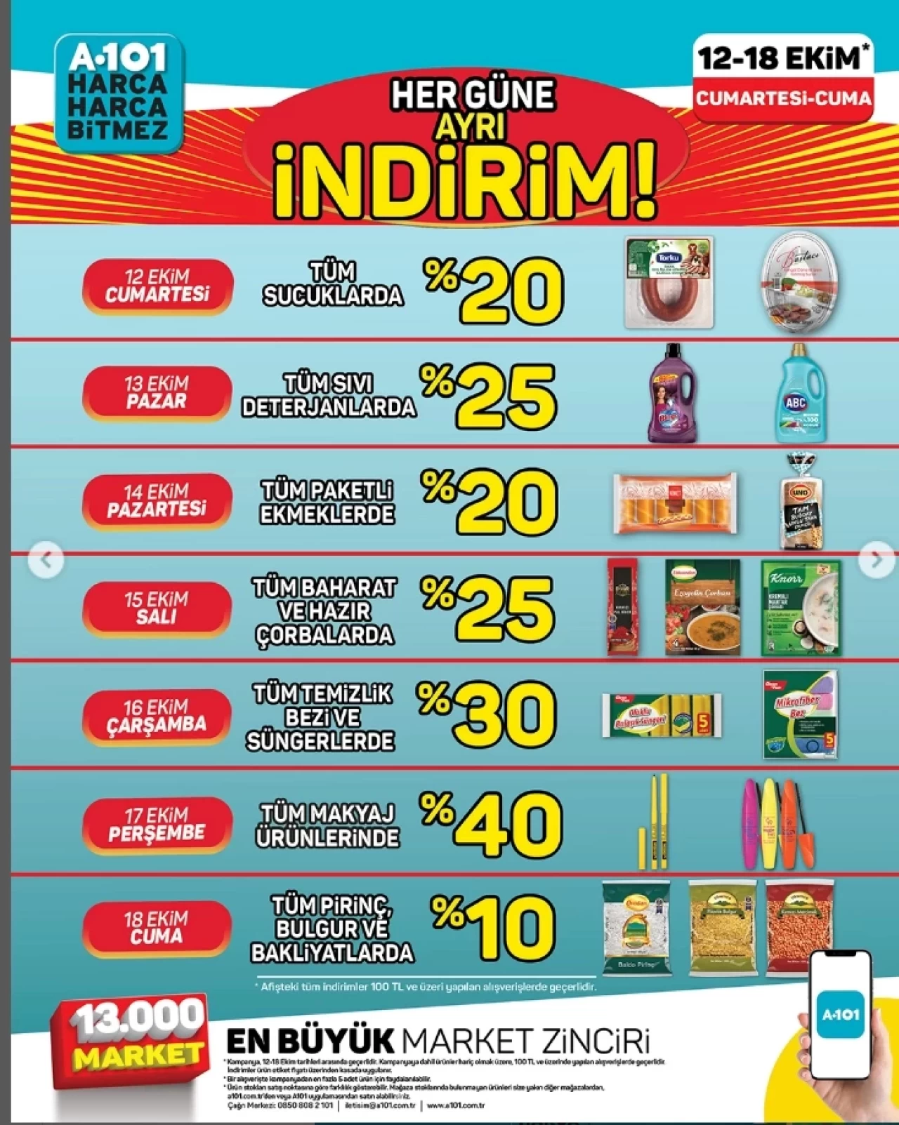 12 Ekim 2024 tarihi ile 18 Ekim 2024 tarihi arasında geçerli olacak indirim furyası A101 marketlerinde müşterilerini bekliyor. Kampanya dahilinde her gün farklı bir kategoride uygulanacak olan indirimlerde neler indirime girecek?