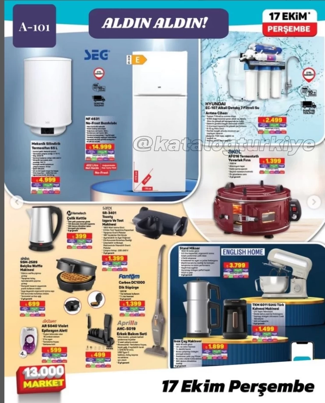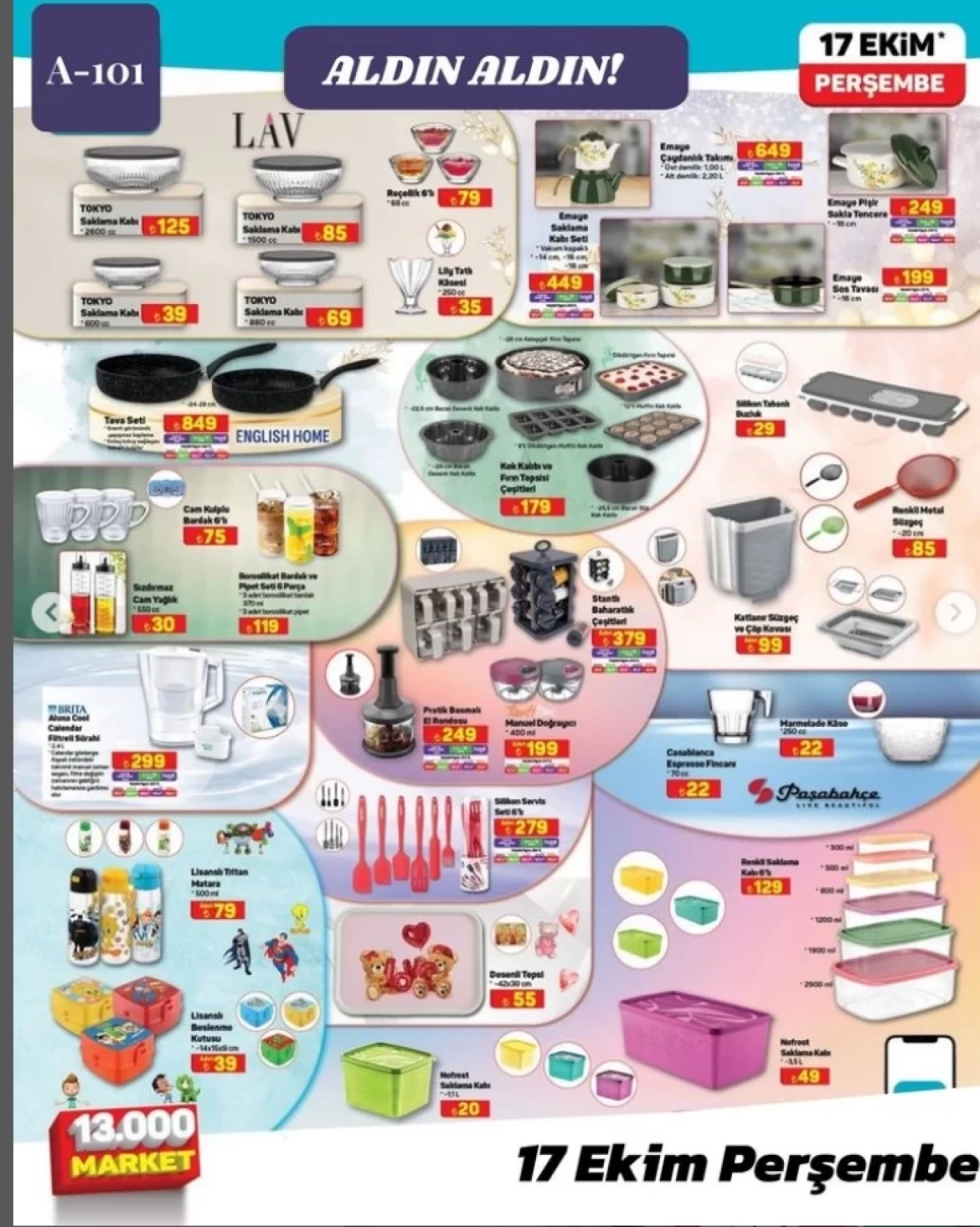 17 Ekim 2024 tarihli aldın aldın kataloğunda çeşit çeşit mutfak ürünlerine yer veren market zinciri hanımların beklediği indirimi başlattı. 17 Ekim 2024 tarihinde başlayacak indirimde çeşitli boy ve şekillerde kek kalıpları yalnızca 179 TL fiyatla satışa sunulacak. Yine A101 marketlerinin vazgeçilmez saklama kapları farklı boyları ile 20 TL’den başlayan fiyatlarla raflarda yerini alacak.