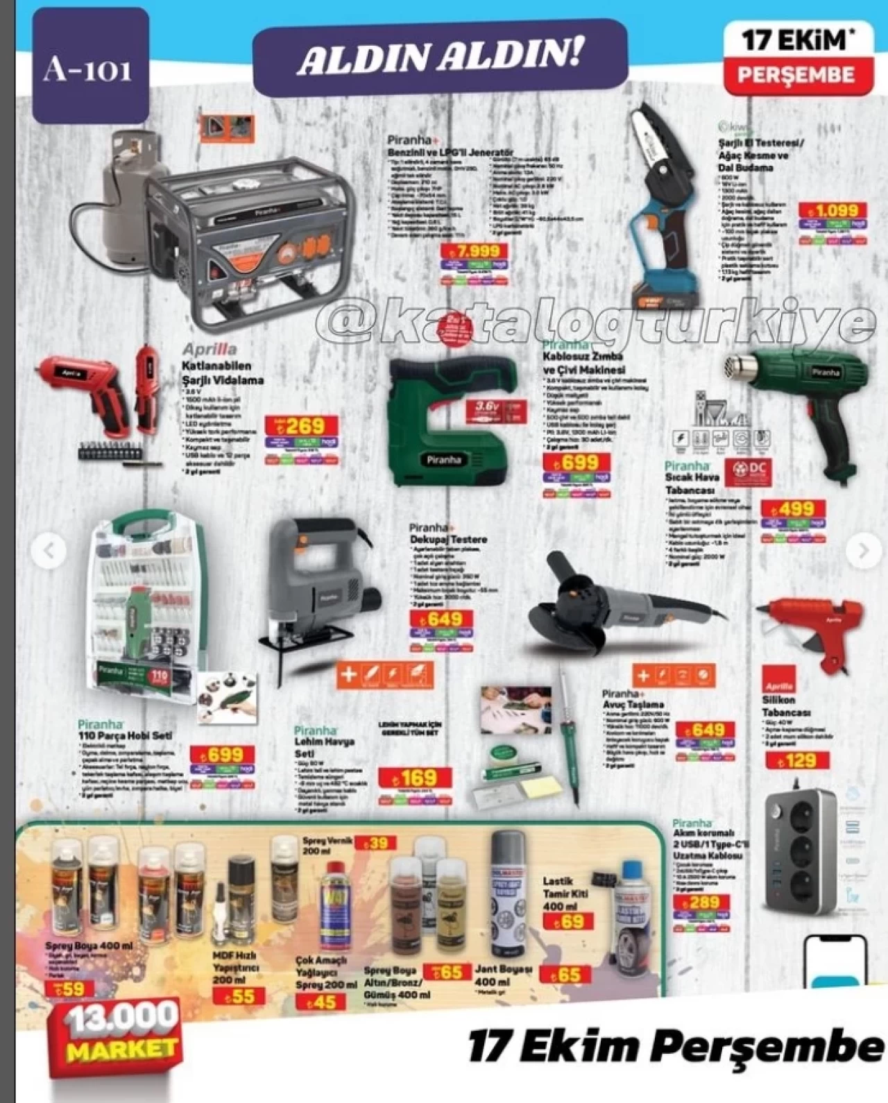 17 Ekim 2024 aktüel kataloğunda beylerinde yüzünü güldüren market zinciri tüm şubelerinde Piranha tamir ve bakım eşyalarının çok uygun fiyatlarla satışta olacağını duyurdu. 17 Ekim 2024 tarihinde A101 marketlerinde;