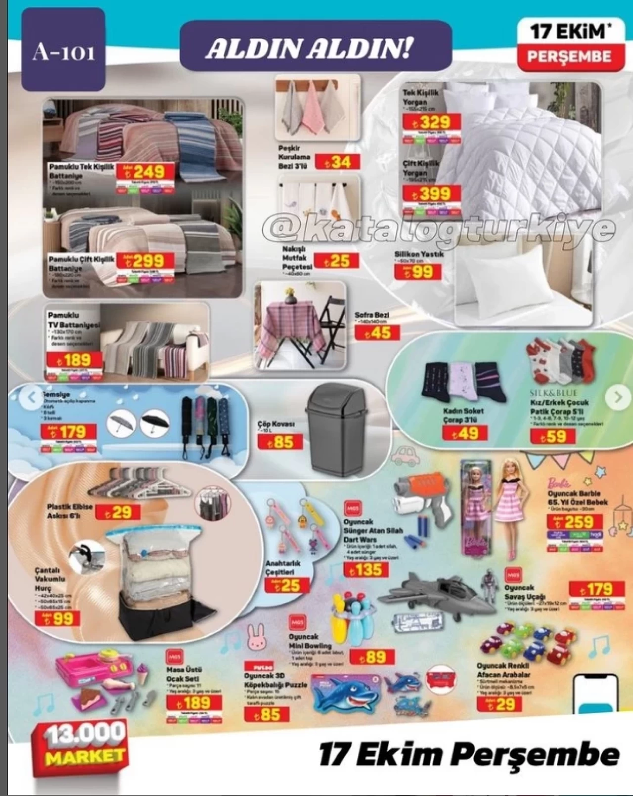 A101 marketleri yeni kataloğunda kış ayının eksiklerini çok uygun fiyatlarla tamamlıyor. Çift kişilik ve tek kişilik yorganları, TV battaniyeleri, normal battaniyelerinin fiyatları ile tüm dikkatleri üzerine çekiyor. 17 Ekim A101 marketlerinde;