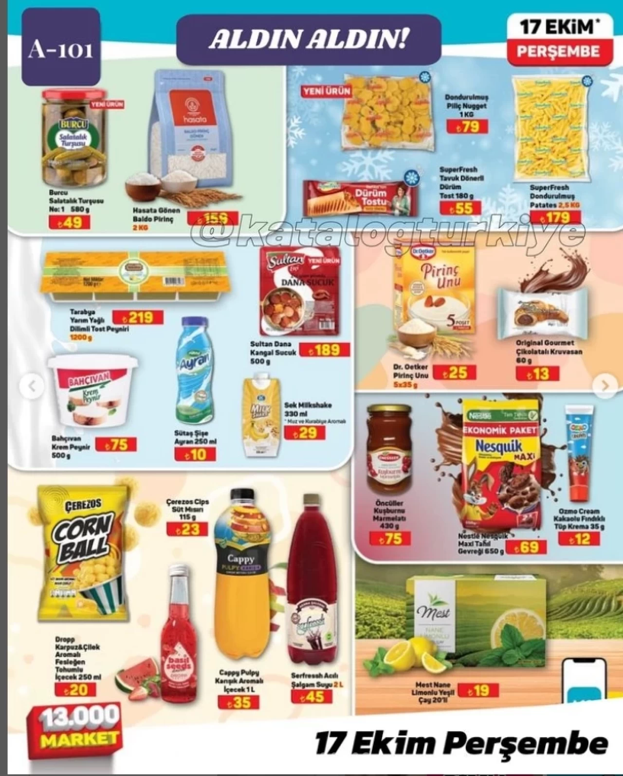 17 Ekim kataloğunda neredeyse her kategoride indirimi olan market zincirinin gıda ürünlerinde de çeşitli indirimler olacak. 17 Ekim kataloğunda yer alan bilgiye göre A101 marketlerinde bu hafta 2 KG Baldo Pirinç 159 TL’den 580 gram salatalık turşusu 49 TL’den, 500 gram dana sucuk 189 TL’den, 1200 gram Tarabya Yarım Yağlı Dilimlenmiş Tost Peyniri 219 TL’den 500 gram bahçıvan krem peynir 75 TL’den satışa sunulacak.