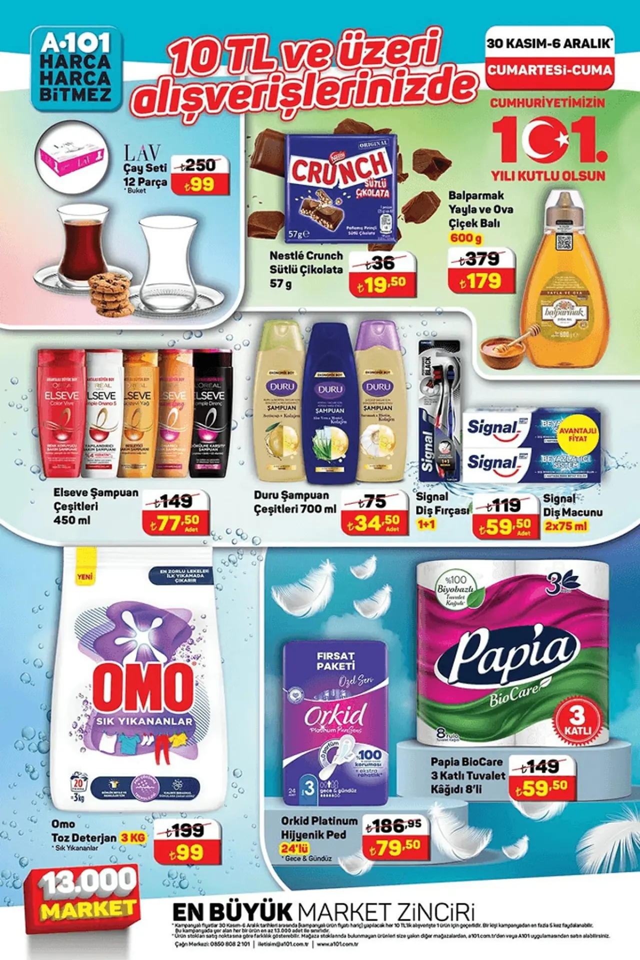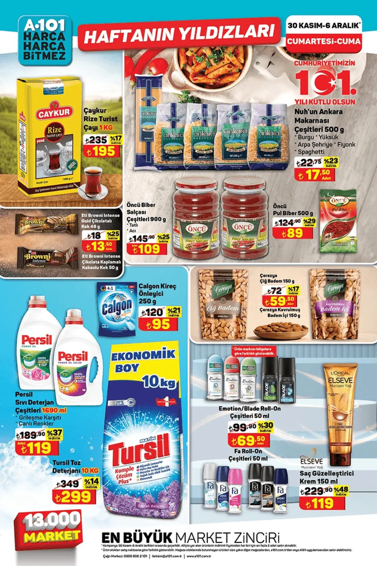 A101, temizlik ürünlerinde de önemli indirimler yapmış. Tursil Toz Deterjan 10 Kg 299 TL, Persil Sıvı Deterjan 1690 ml 119 TL ve Omo Toz Deterjan 3 Kg 99 TL'ye satılıyor. Calgon Kireç Önleyici 250 gr ise 95 TL'ye alıcı buluyor. Bu indirimler, ev temizlik ürünleri alışverişini cazip hale getiriyor.