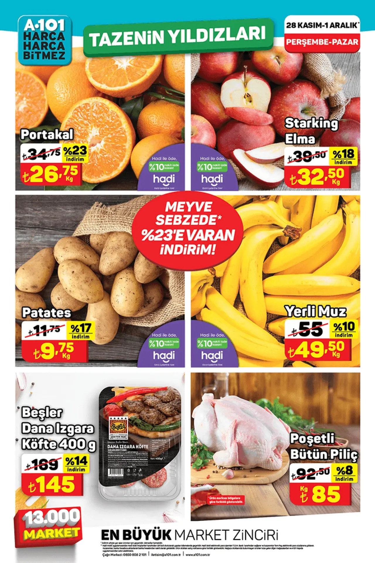 A101, et ve süt ürünlerinde de çeşitli fırsatlar sunuyor. Şahin Dana Parmak Sucuk 320 gr 215 TL, Ramiz Dondurulmuş Dana Köfte 500 gr 219 TL'ye satılıyor. Pınar Yarım Yağlı Süzme Peynir 1 Kg ise 119 TL'ye alıcı buluyor. Bu ürünler, hafta boyunca A101 marketlerinde uygun fiyatlarla satışa sunulacak.