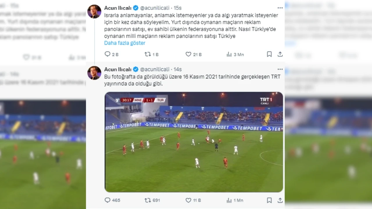 Acun Ilıcalı, TV8 kanalının ve Exxen’in bu olayla ilgisinin olmadığını savundu. “Yurt dışında oynanan maçların reklam panolarının satışı, ev sahibi ülkenin federasyonuna aittir” diyen Ilıcalı, Türkiye Futbol Federasyonu’nun Türkiye'deki milli maçların reklam panolarını sattığına da dikkat çekti. Acun Ilıcalı, bu açıklamalarıyla olayı net bir şekilde izah etti.