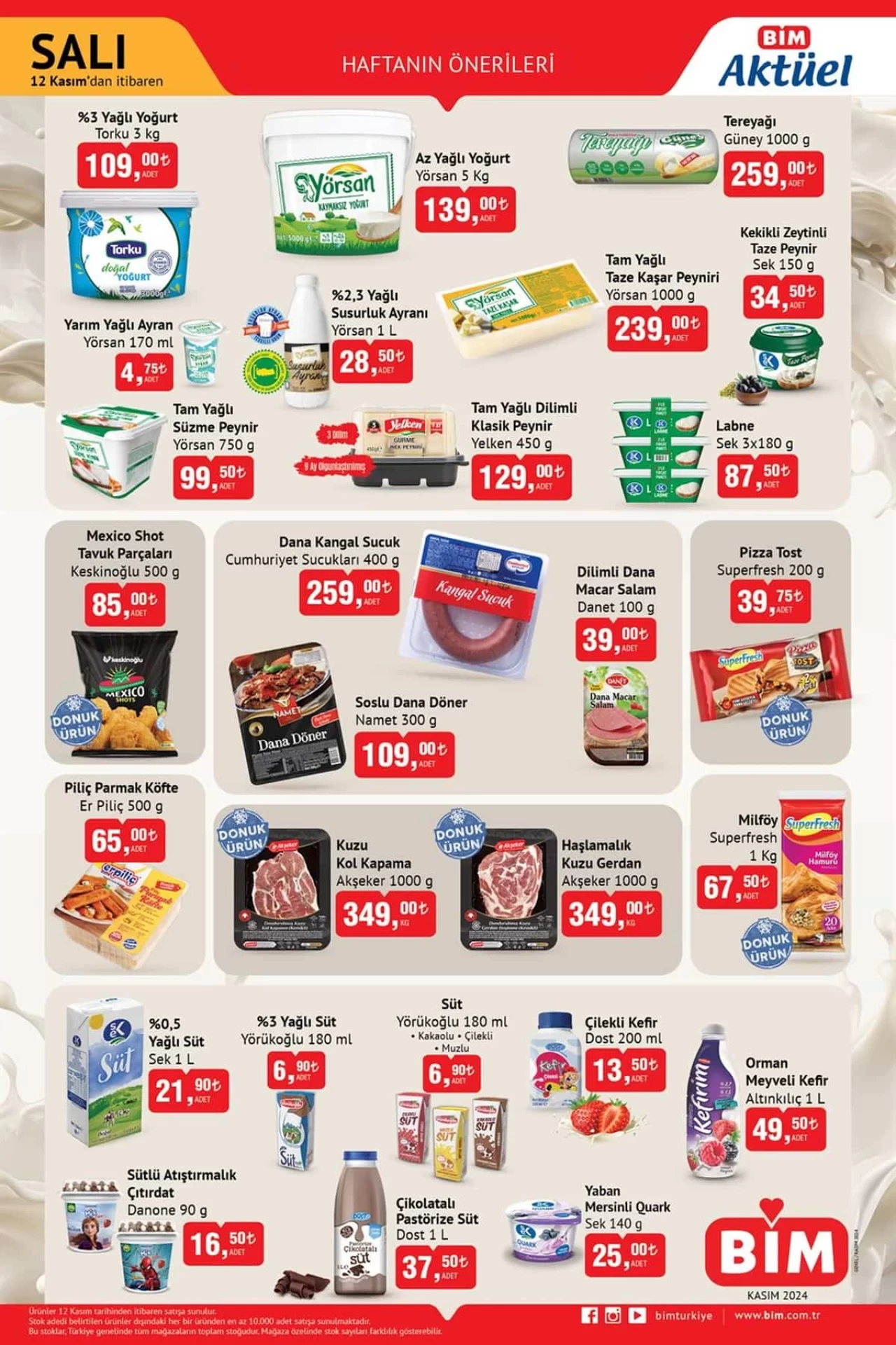 Bim, bu hafta ayrıca birçok temel gıda ürününde de indirimler sunuyor. Tereyağı olarak Güney markalı 1000 gramlık tereyağı 259 TL’ye, Sek’in kekikli zeytinyağı 150 gram ise 34,50 TL’ye satılacak. Aşağıda, 12 Kasım 2024 Bim Aktüel Kataloğu’ndaki bazı ürünlerin fiyatları ve detayları yer almaktadır: