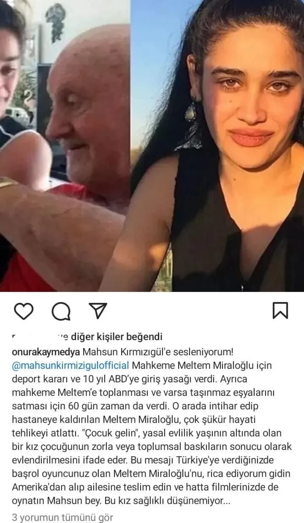 Onur Akay, Meltem Miraloğlu'nun hayati tehlikeyi atlattığını ve durumu ile ilgili güncellemede bulundu. Akay, ünlü sanatçı Mahsun Kırmızıgül’e seslenerek, Miraloğlu’nun yasal sorunlarına dikkat çekti. Akay, "Mahsun Kırmızıgül'e sesleniyorum! Mahkeme, Meltem Miraloğlu için deport kararı ve 10 yıl ABD'ye giriş yasağı verdi" dedi.