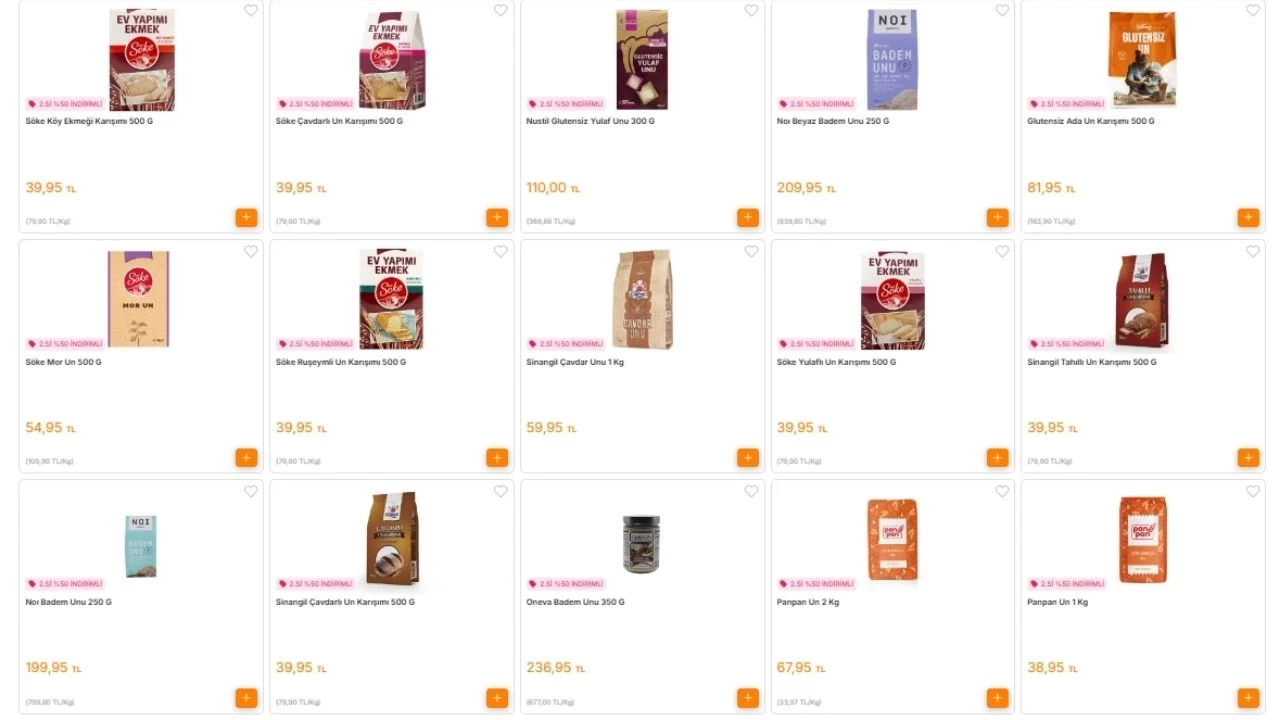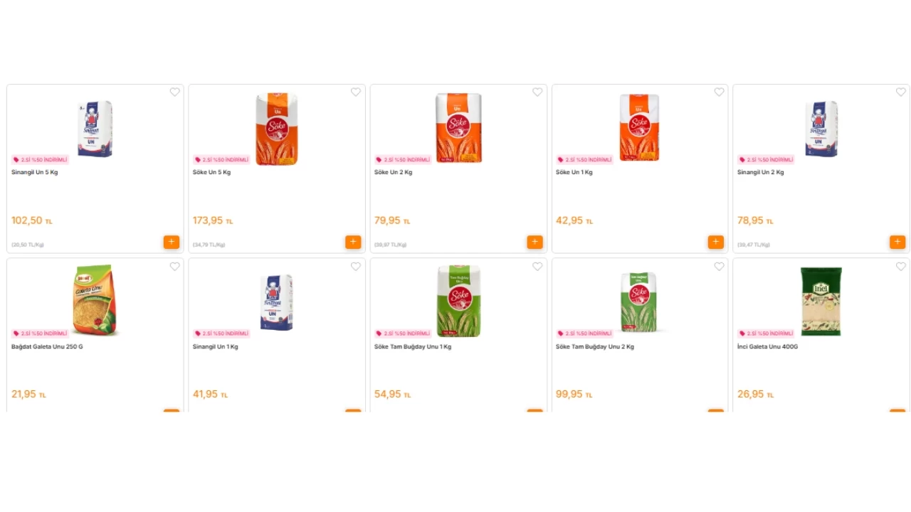 | Söke Un 5 Kg | 173,95 TL | 86,98 TL (2.si %50 İndirimli) | (34,79 TL/Kg) |