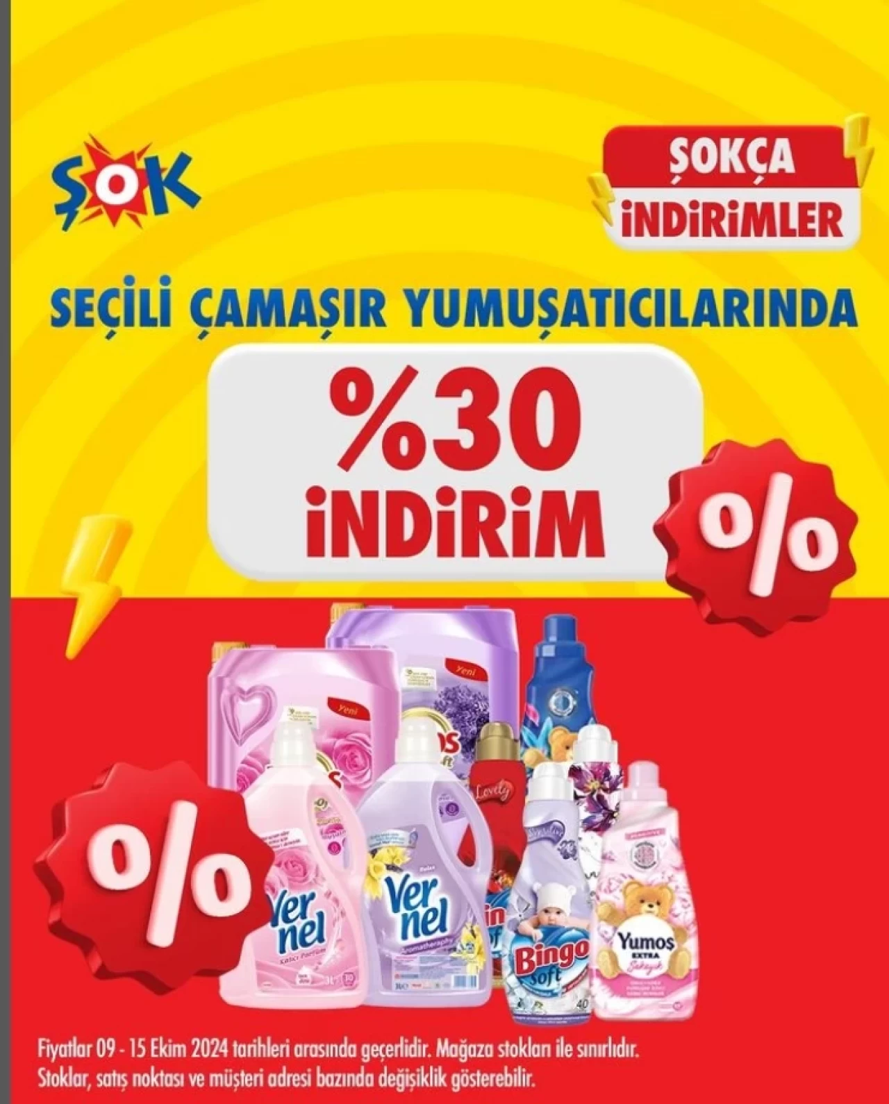 Şok zincir marketleri ekstra indirimlerinde seçili çamaşır yumuşatıcılarında %30’a varan indirim uygulanacağını duyurdu. Ayrıca, her evin demirbaşı haline gelen ıslak ve yüzey temizleme havlularında da %15 indirim müjdesini verdi.
