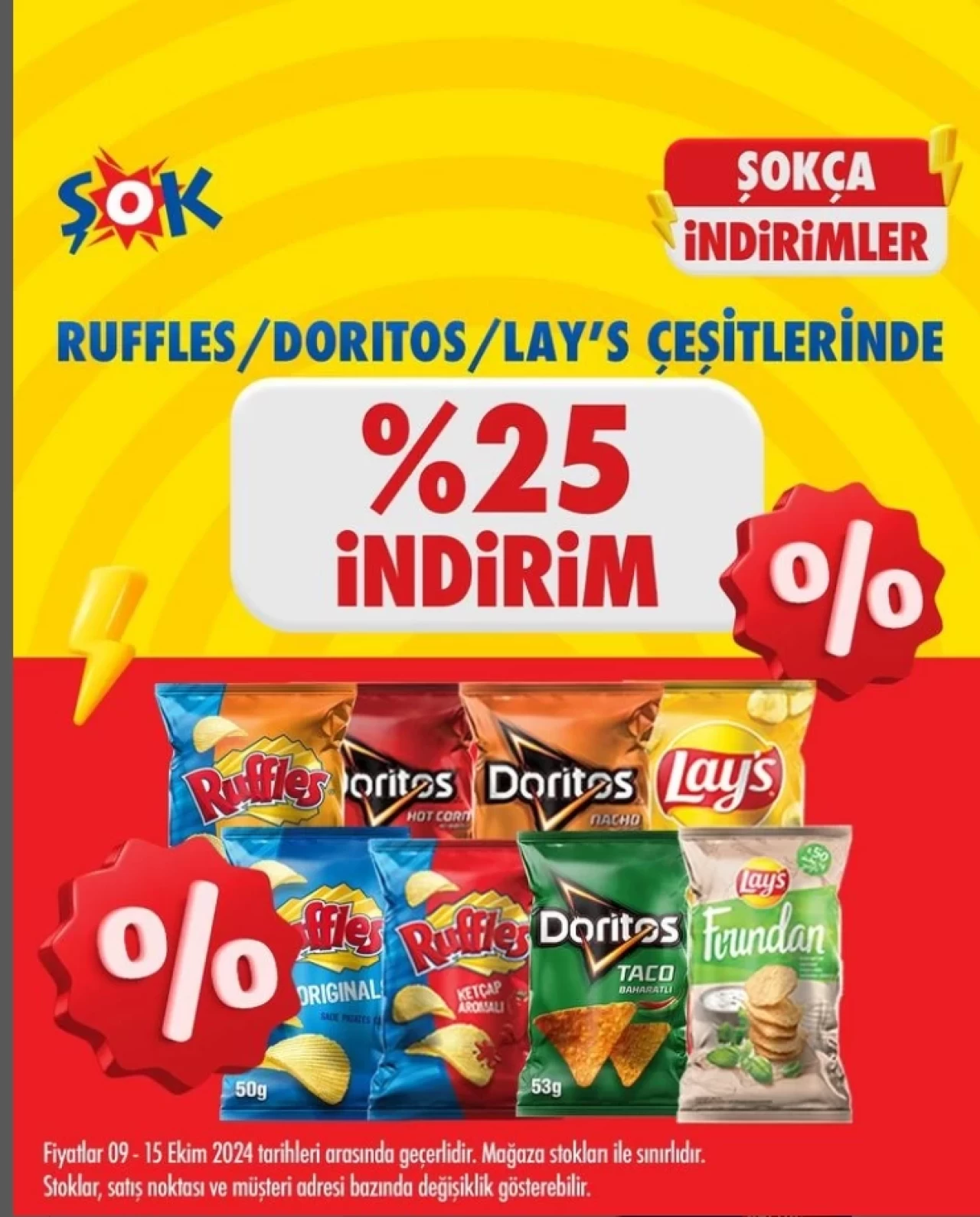 Tüm bu kategorilerin yanı sıra 2’si 1 arada veya 3’ü 1 arada kahve çeşitlerinde %25, tüm marka ve çorba çeşitlerinde ise %30 indirim müjdesi duyuruldu. Aynı zamanda Ruffles, Doritos, Lay’s çeşitlerinde de %25 indirim müşterilerini bekliyor.