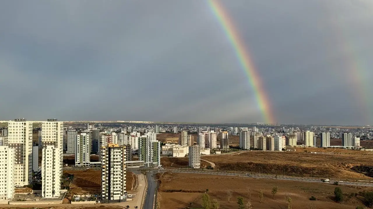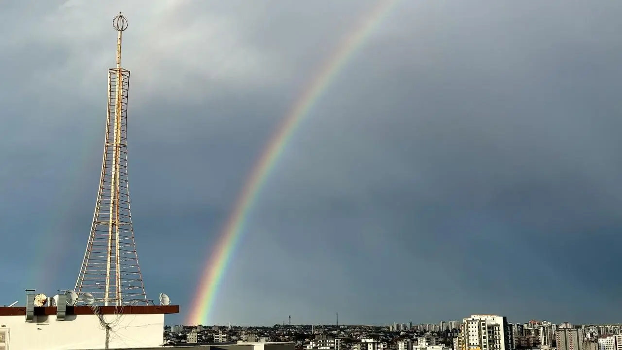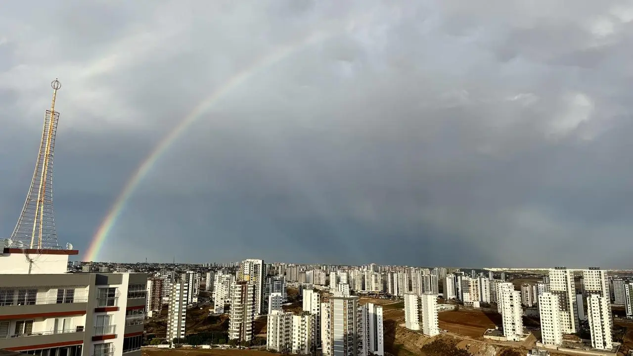 Adana'da sağanak sonrası gökyüzünde beliren gökkuşağı, kartpostallık bir manzara yarattı. Renklerin uyumu, izleyenleri büyüledi.