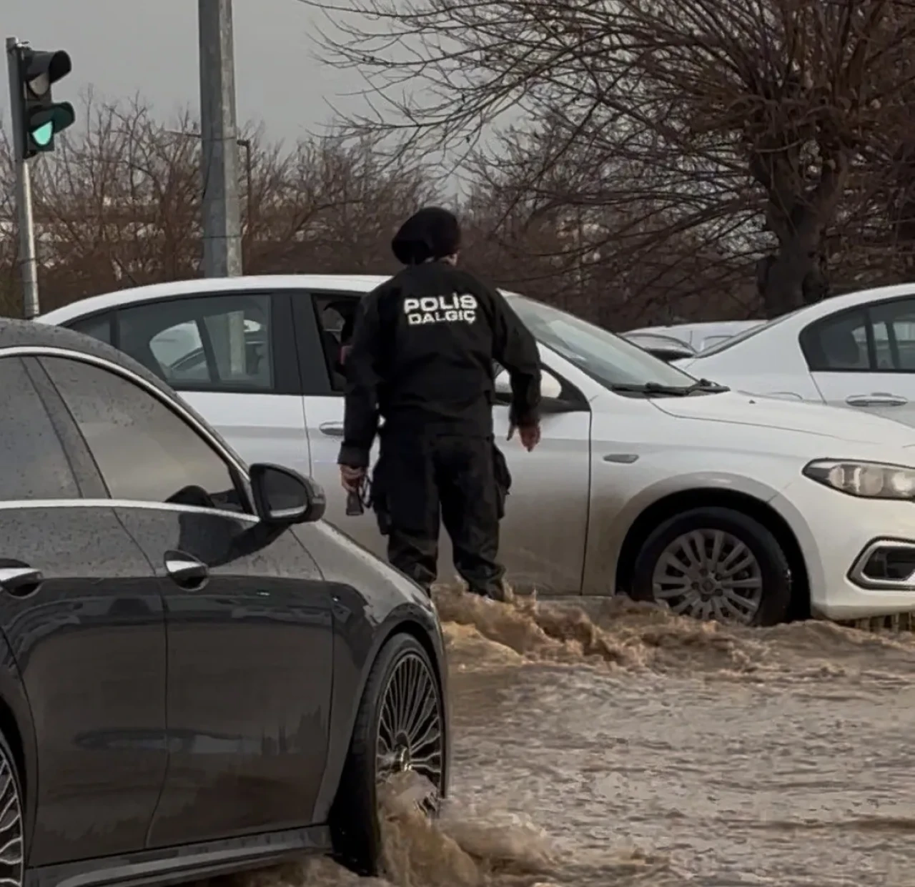 Yüreğir Devlet Hastanesi önünde dalgıç polisler, trafiği açmak için sürücülere yardım etti. Araçların yolda kalmasıyla trafik tamamen durdu.