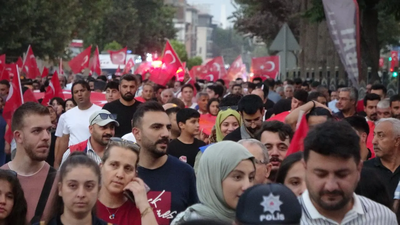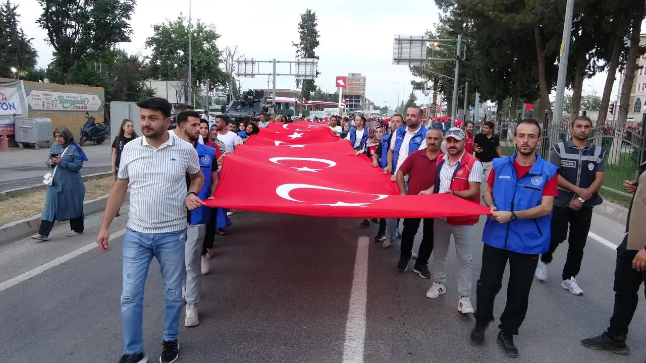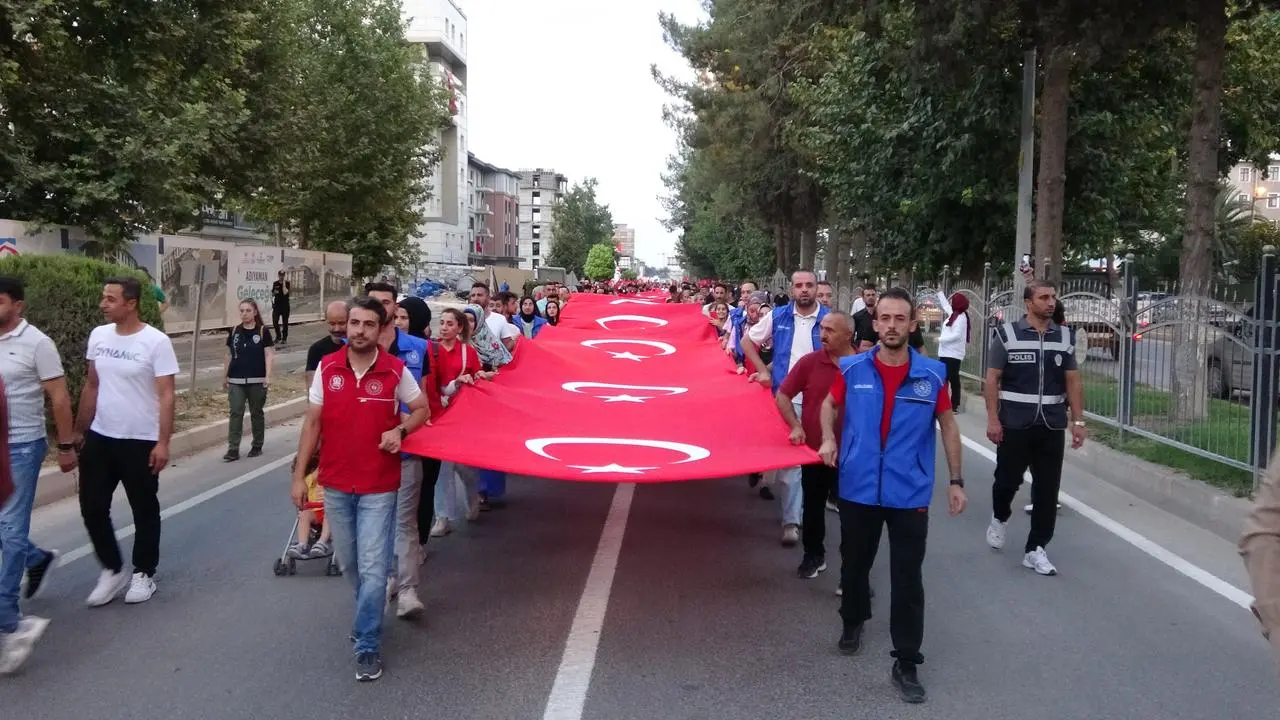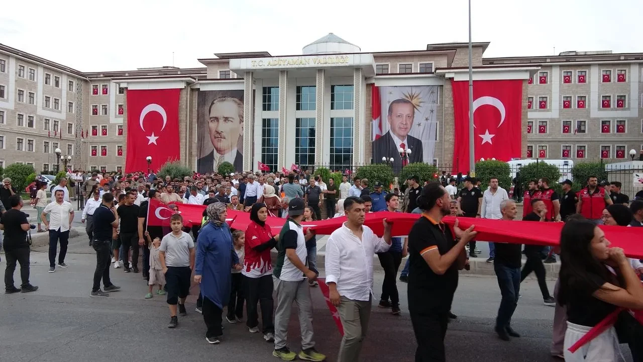 Adıyaman Valiliği önünde toplanan kalabalık, Atatürk Bulvarı’nda kortej yürüyüşü gerçekleştirdi. Yürüyüşte 100 metrelik Türk bayrağı vatandaşların omuzlarında taşındı.