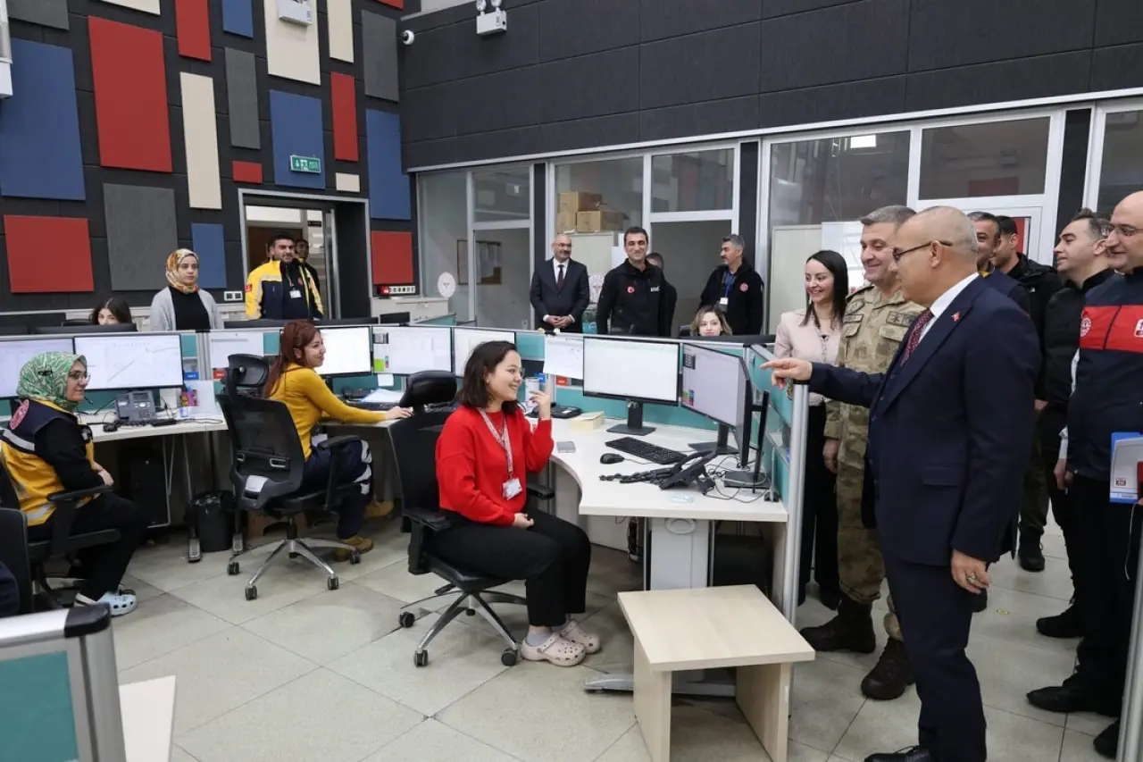 Vali Koç, ilk olarak 112 Acil Çağrı Merkezi’ni ziyaret ederek personelle bir araya geldi. Vatandaşların güvenliği için verdikleri emekten dolayı teşekkür etti.