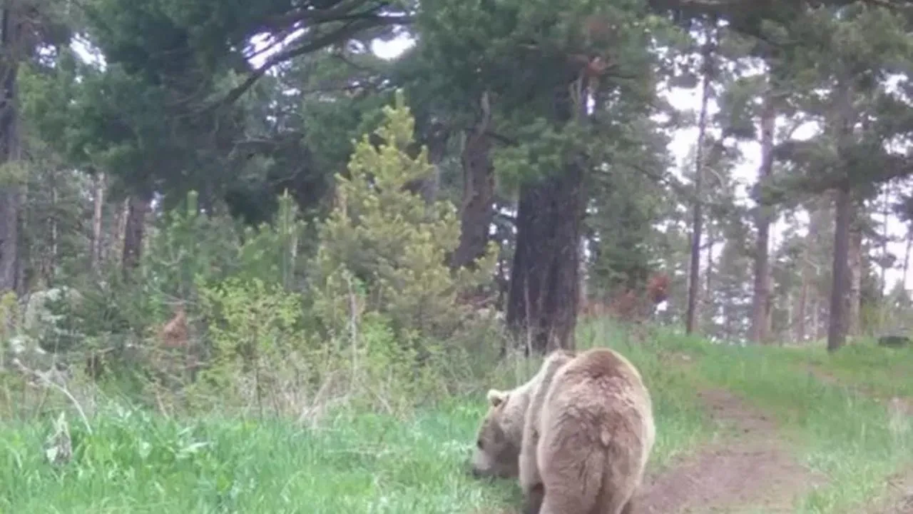 Ardahan'ın Yalnızçam ormanlık bölgesinde ot yiyerek beslenen bozayı, fotokapan tarafından görüntülendi.