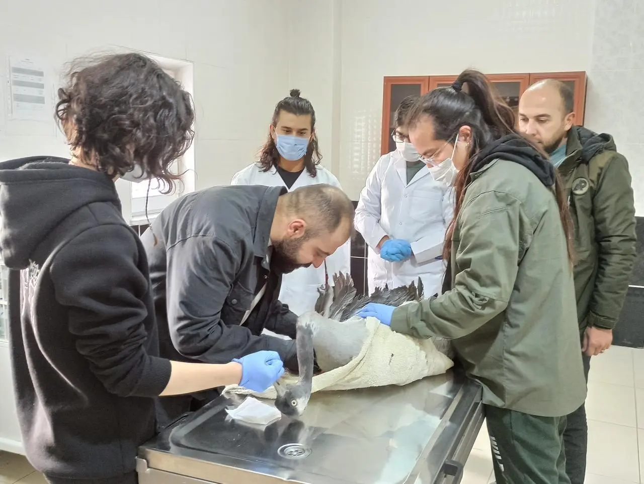 Veteriner hekimler tarafından muayene edilen kuşun tedavisi başladı. İyileşme sürecinin ardından turna, doğal yaşamına geri dönecek.