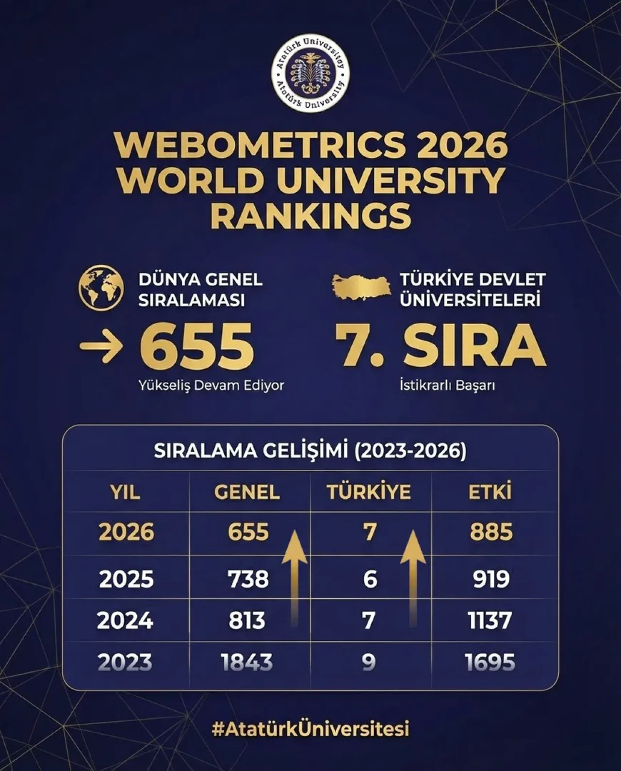 Atatürk Üniversitesi, Webometrics sıralamasında üç yılda bin 200 basamak yükselerek dünya genelinde 655. sıraya yerleşti. Bu başarı, üniversitenin akademik üretkenlik ve dijital görünürlük alanındaki çabalarının sonucu.