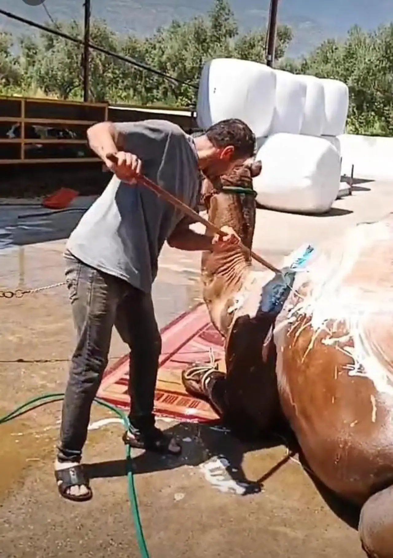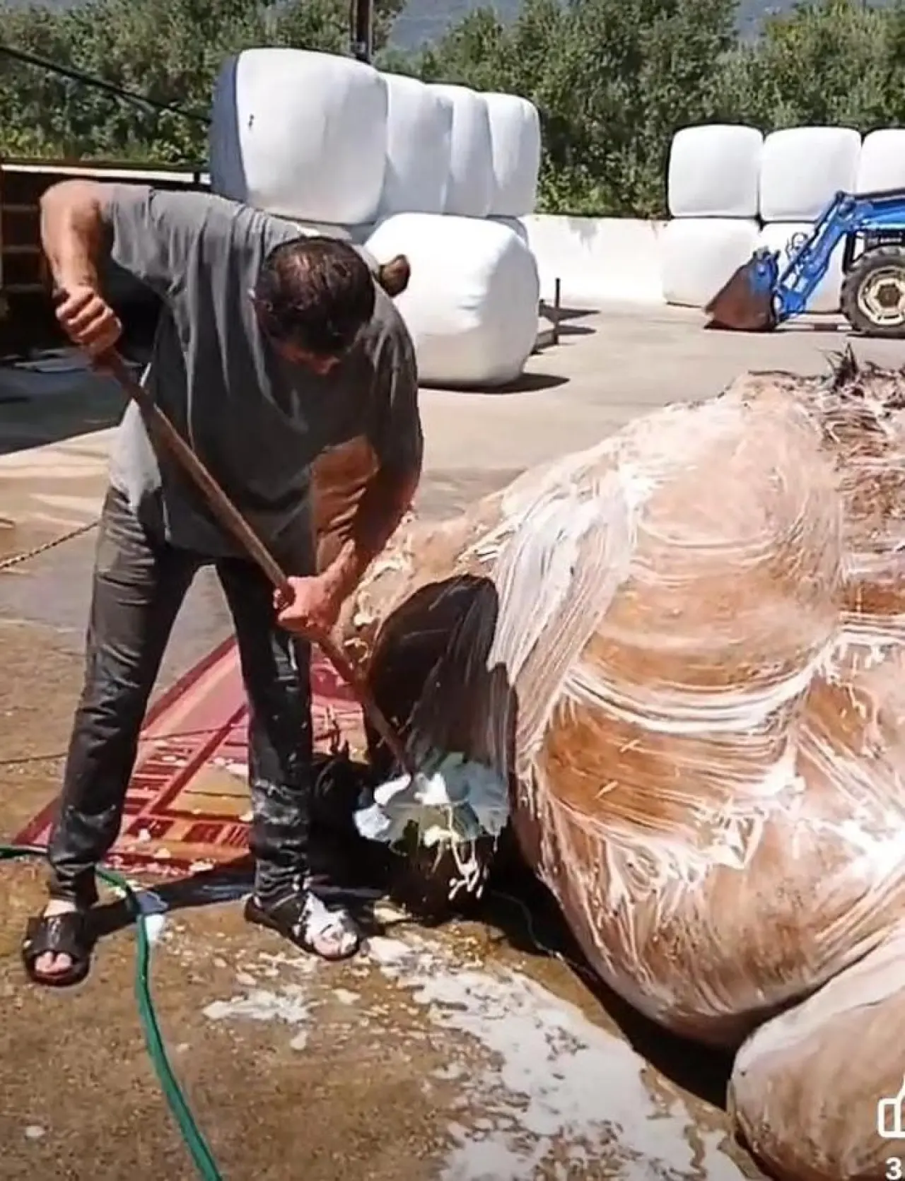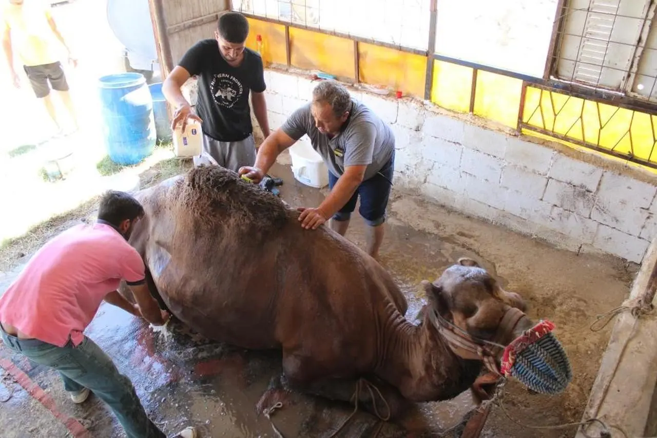 Develer önce katran karışımı zeytinyağı ile yağlanıyor ardından sabunla yıkanıyor. Bu uygulama develerin rahatlamasına ve haşerelerden korunmasına yardımcı oluyor.