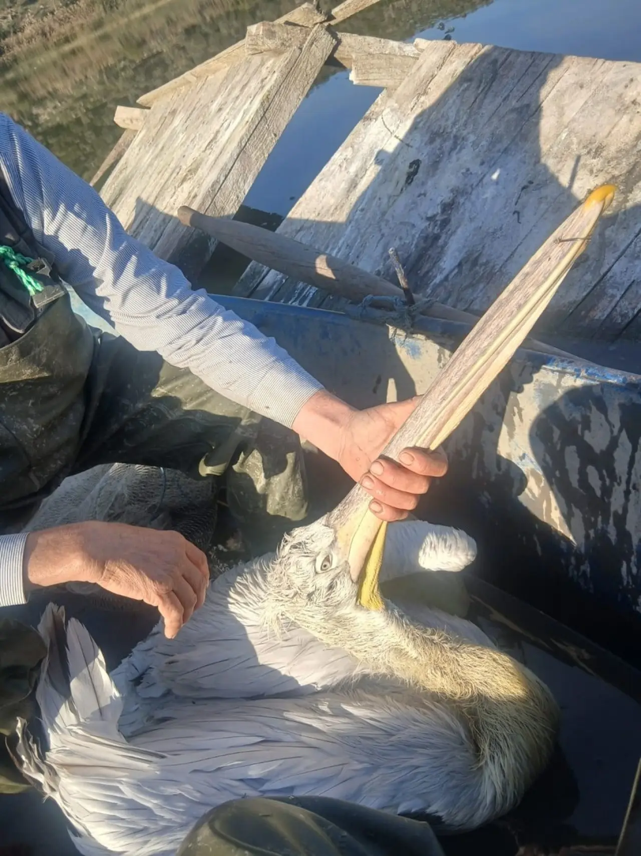 Yeşilköy Su Ürünleri Kooperatifi Başkanı Fahrettin Öztürk ve yardımcısı Ali Dayı, pelikanın platformda hareketsiz durduğunu fark etti. Kuşun gagasına dolanan olta iğneleri dikkatle çıkarıldı.