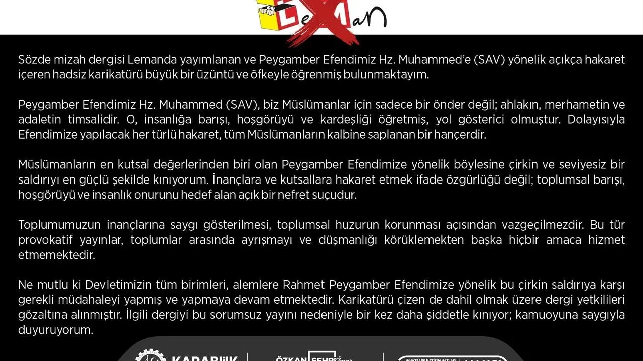 Karabük Belediye Başkanı Özkan Çetinkaya, Leman Dergisinde yayımlanan Hz. Muhammed'e hakaret içeren karikatüre tepki gösterdi.