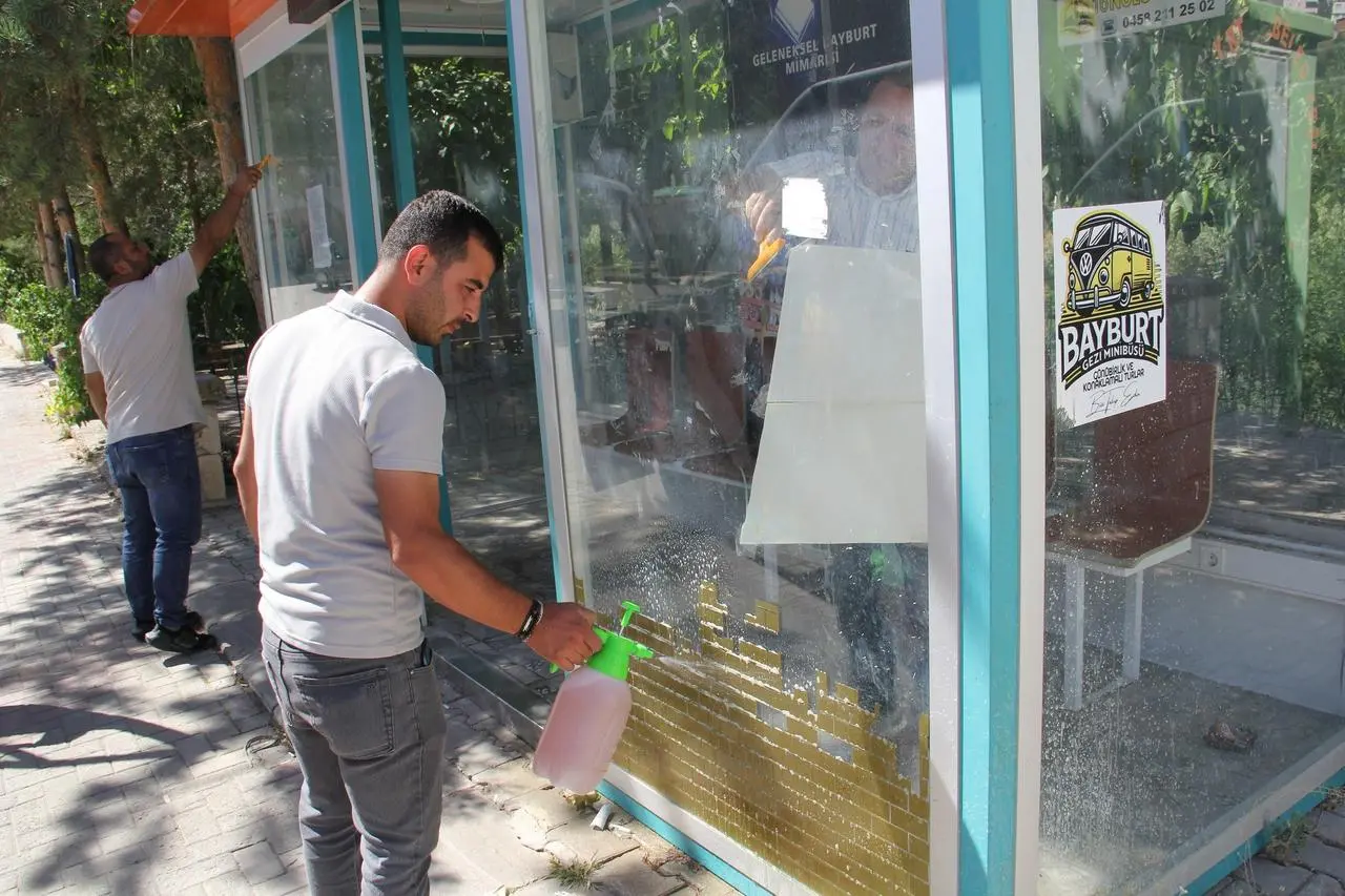 Bayburt Belediyesi, şehir genelindeki dolmuş duraklarında kapsamlı bir temizlik çalışması başlattı. Durakların iç ve dış yüzeyleri temizlenerek zemin ve oturma alanları dezenfekte edildi.
