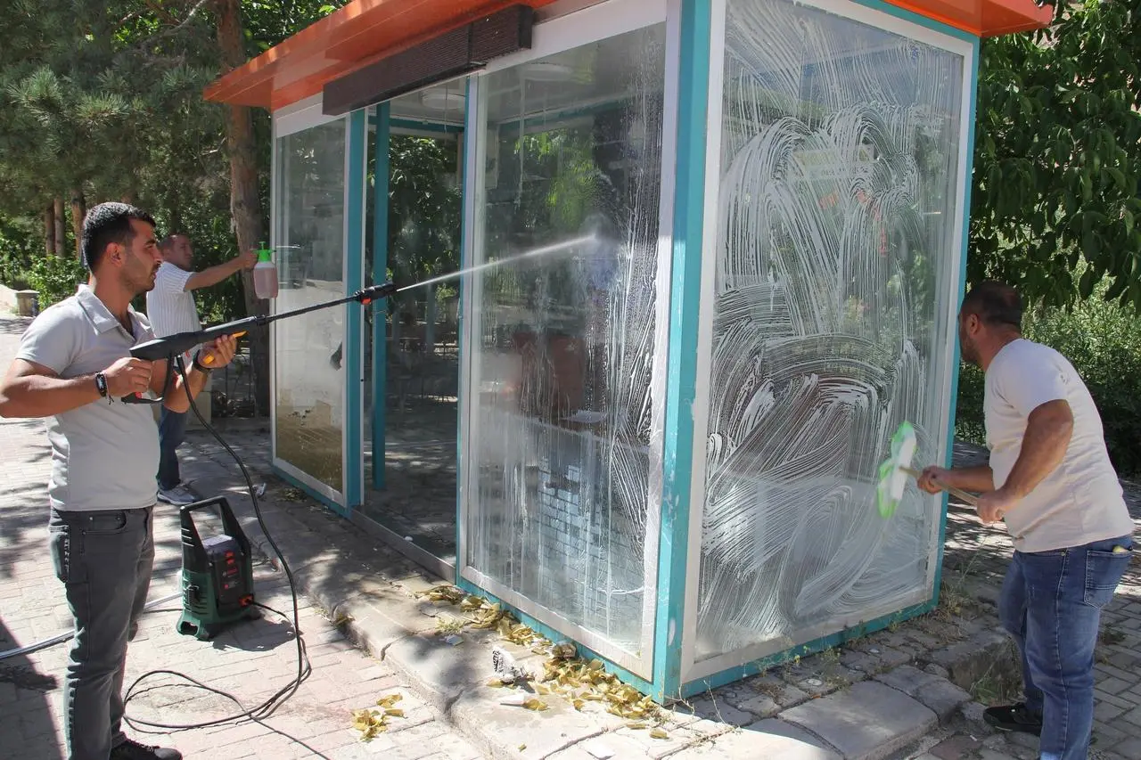 Durak camlarına yapıştırılan reklam afişleri kaldırıldı ve camlar özel solüsyonlarla yıkandı. İç kısımlarda zemin, oturma alanları ve duvarlar detaylıca dezenfekte edildi.