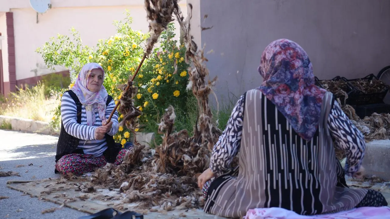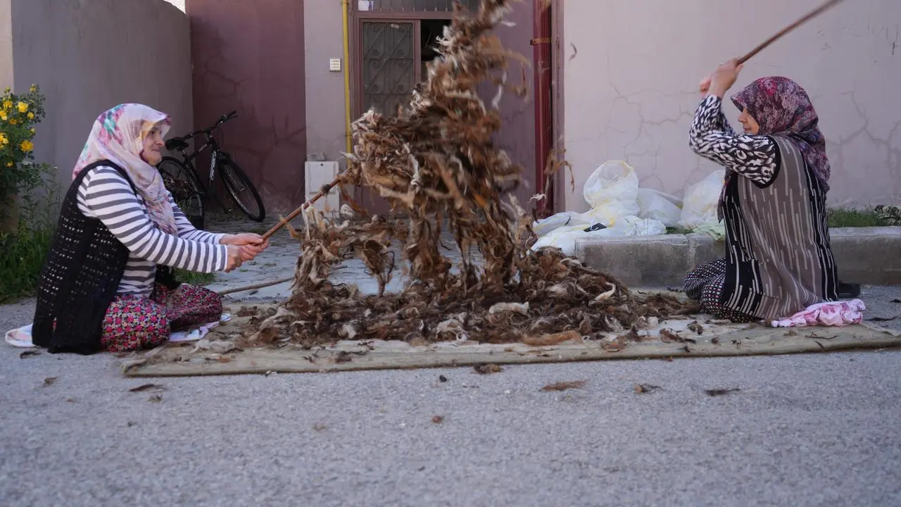 Kadınlar yünleri önce bol su ile yıkayıp tellerde kurutma işlemi yapıyor. Ardından muşamba üzerinde odun sopalarla saatlerce çırparak yünleri tel tel ayırıyorlar.
