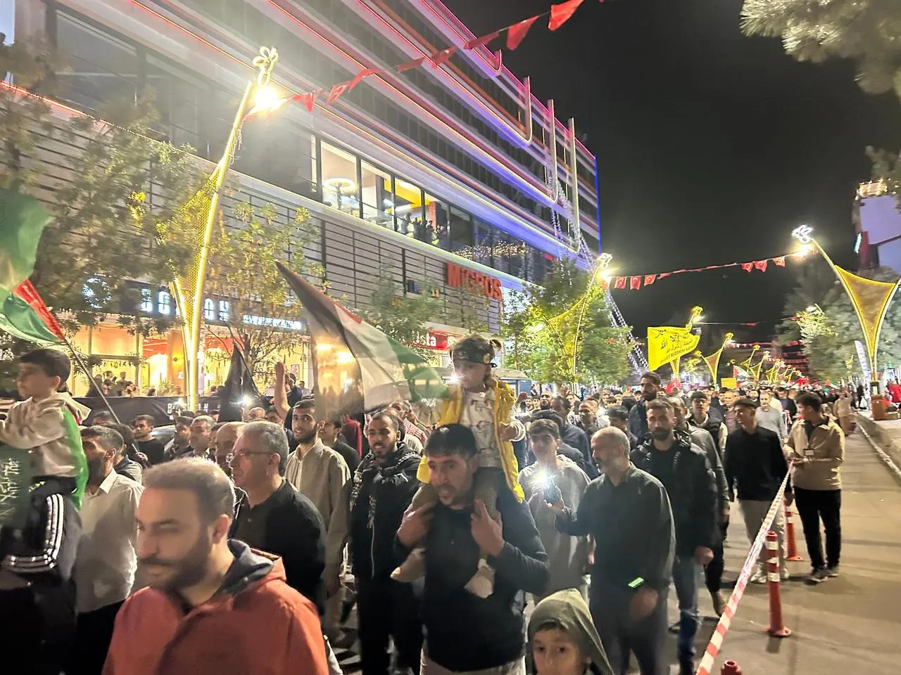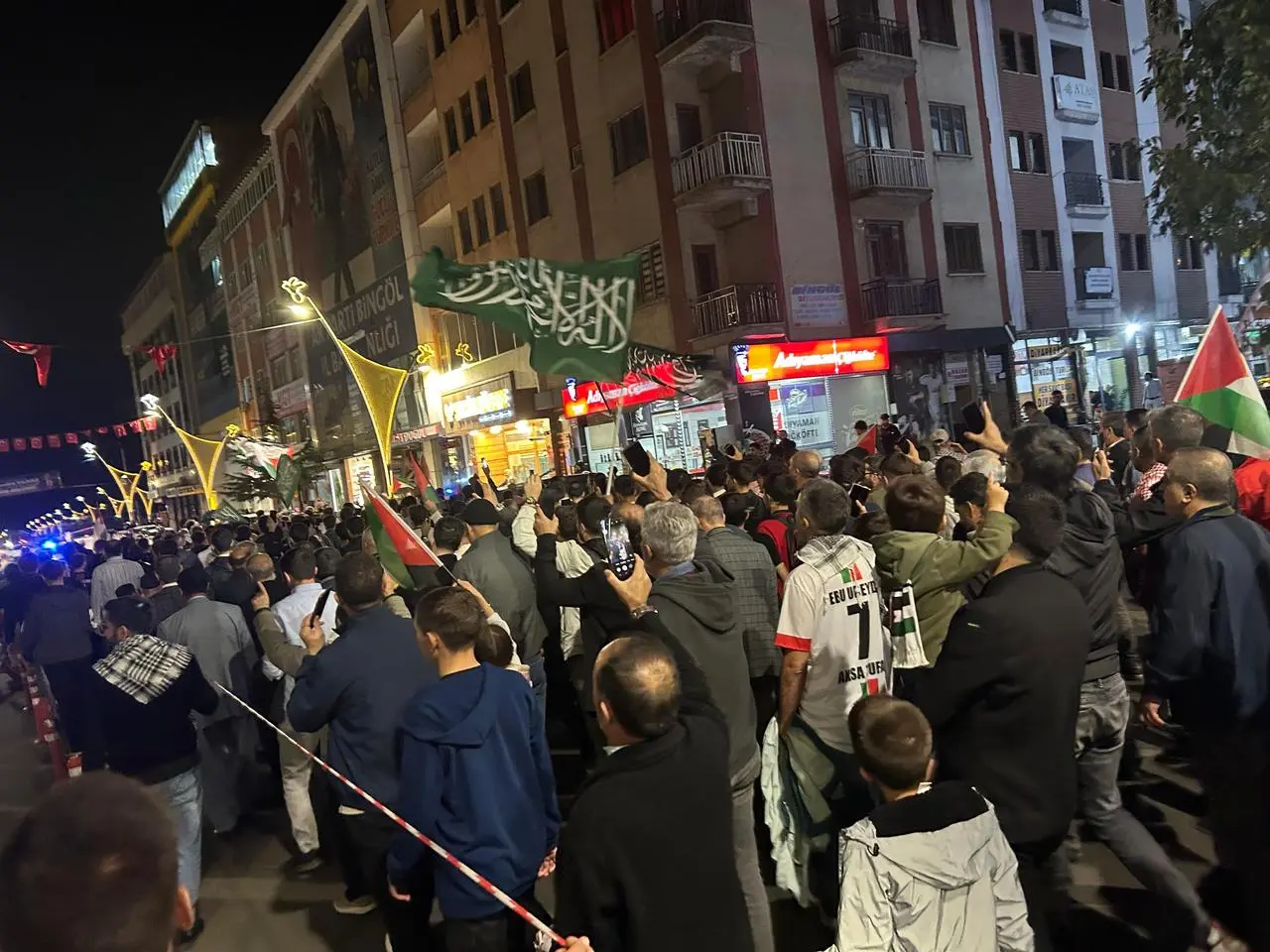 Hacı Hıdır Cami önünde bir araya gelen kalabalık, Filistin bayraklarıyla yürüyüş gerçekleştirdi. İsrail karşıtı sloganlar atan grup, Valilik Kavşağı'na kadar ilerledi.