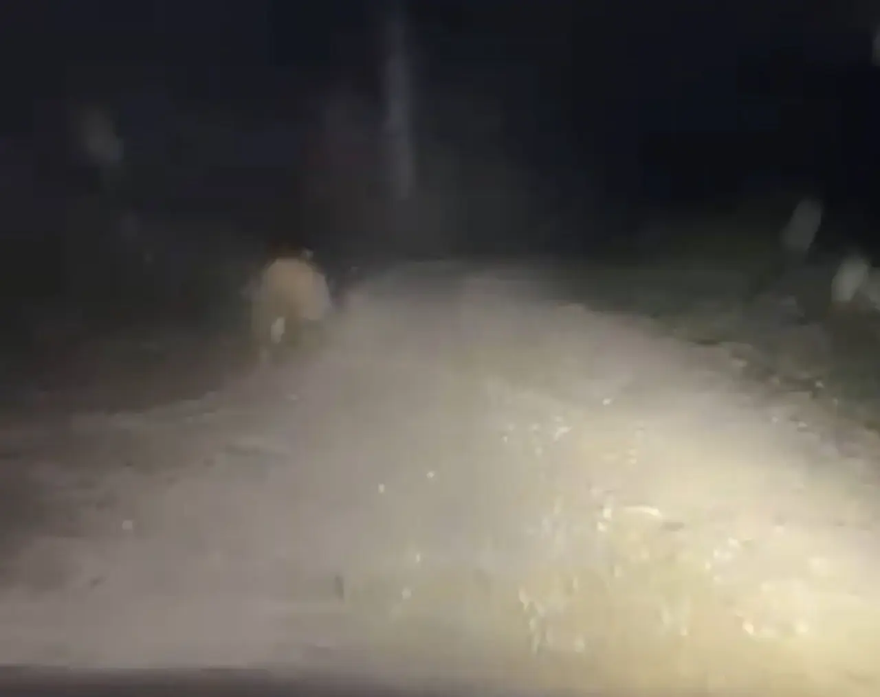 Elmalık köyü yakınlarında aniden yola çıkan ayı, far ışığına maruz kalınca hızla uzaklaştı. Yaklaşık 50 metre koştuktan sonra tarlada gözden kayboldu.