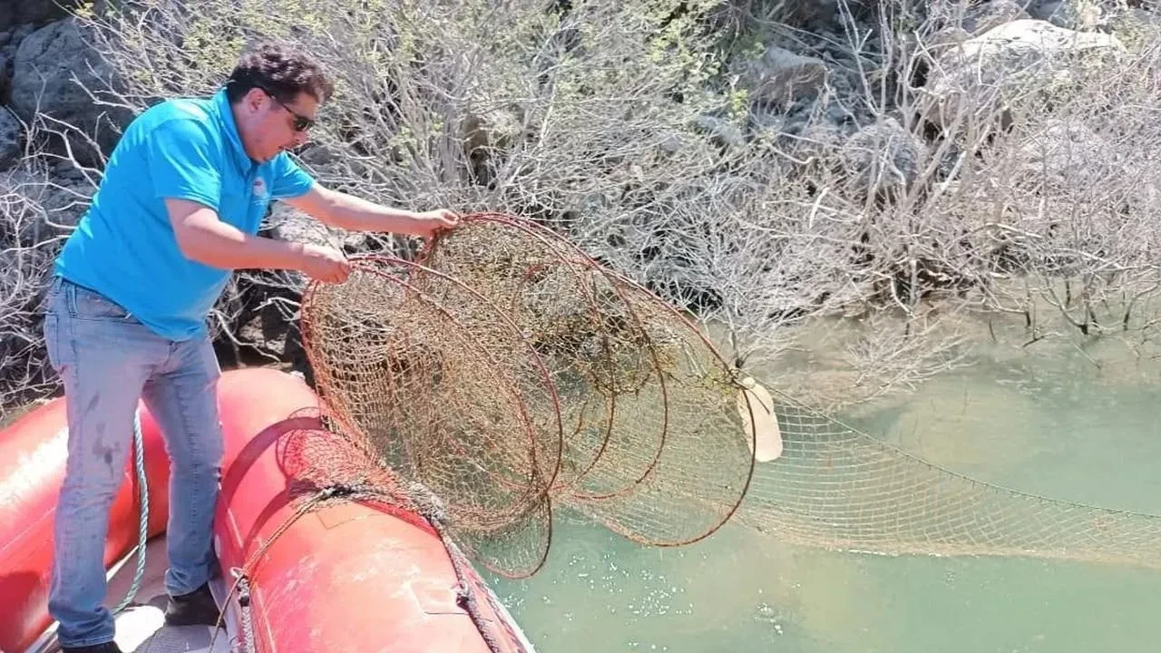 Aydın'ın Bozdoğan ilçesinde kontrolsüz bırakılan hayalet ağlar, ekipler tarafından Kemer Baraj Gölü'nden çıkarıldı.
