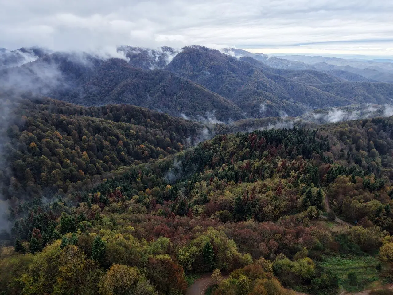 900 rakımlı Çam Dağı, yeşil, sarı ve kızıl tonlarıyla adeta bir tablo gibi görünüyor. Sis tabakası, ormanlık alanlara gizemli bir hava katıyor.