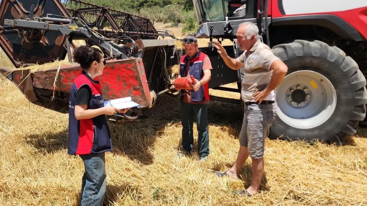 İl Tarım ve Orman Müdürlüğü ekipleri biçerdöver ve balya makinalarını kontrol ediyor. Teknik ekipler özellikle yangın söndürücü ve operatör belgelerini inceliyor.