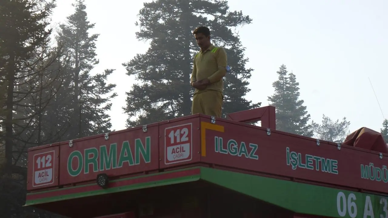 Orman İşletme personeli, yangınla mücadele sırasında ikindi namazını araç üzerinde kıldı. Bu anlar kameraya yansıdı.