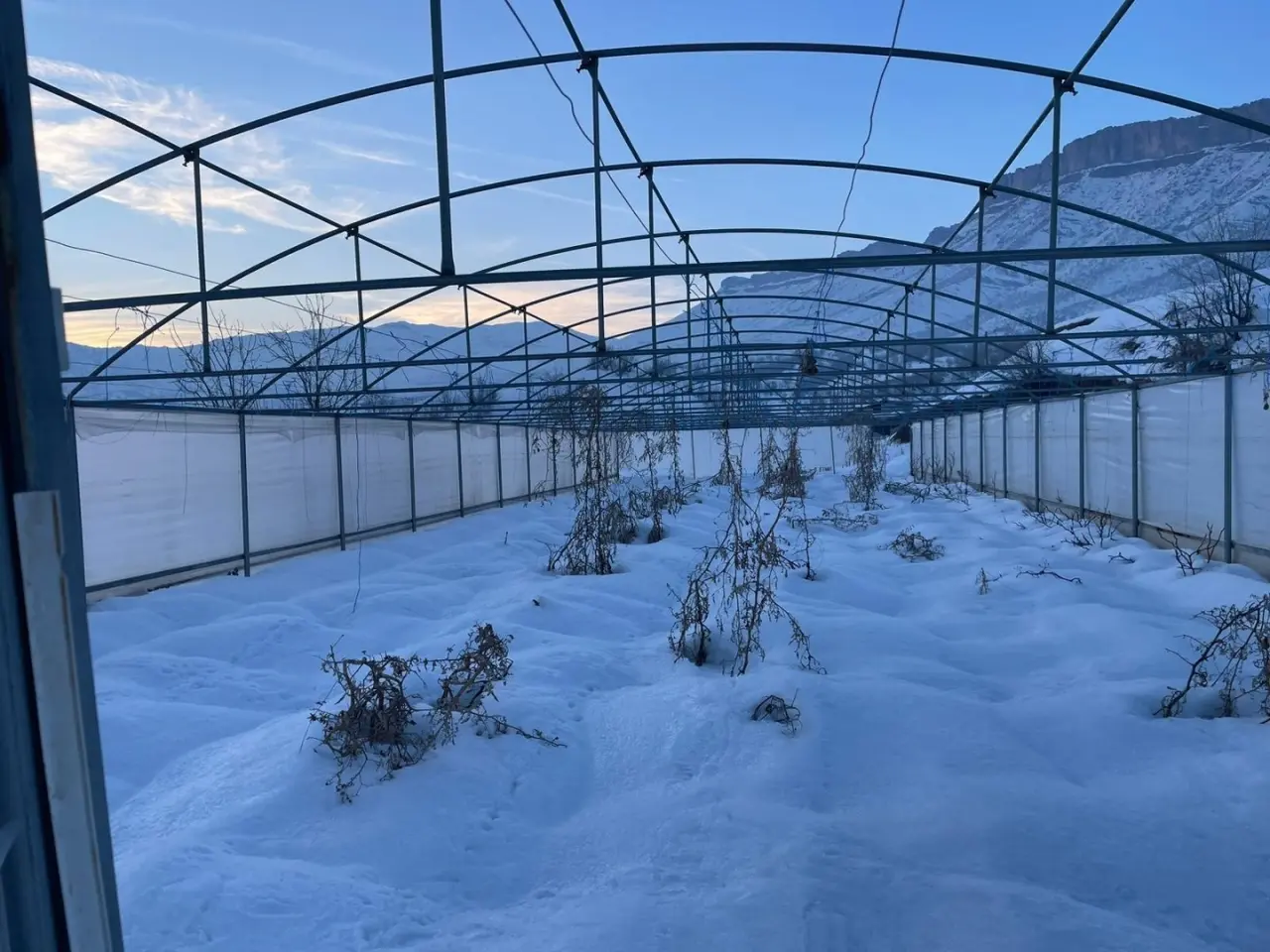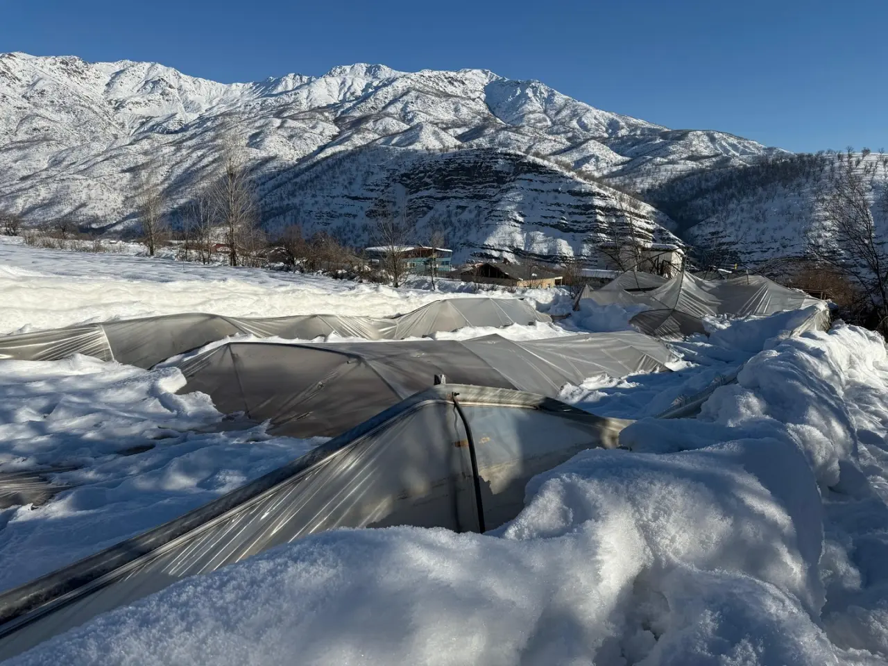 Hakkari'nin Derecik ilçesinde yoğun kar yağışı nedeniyle 38 sera çöktü, çiftçiler büyük zarar gördü.