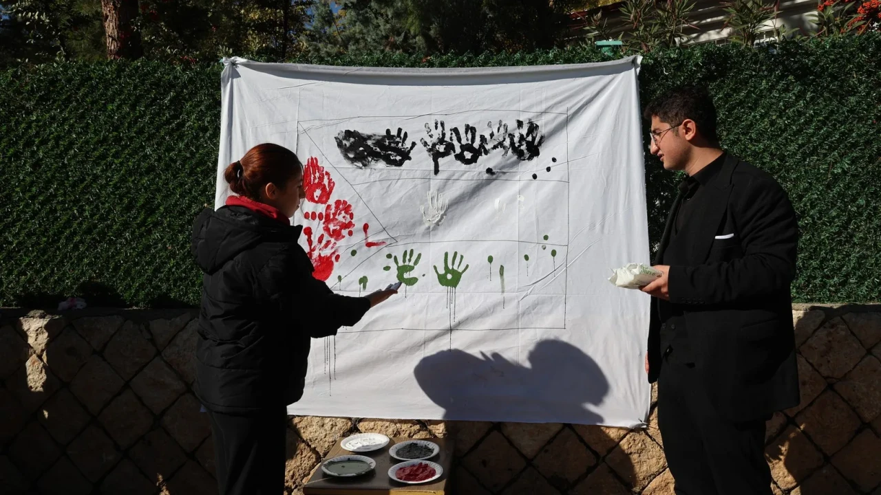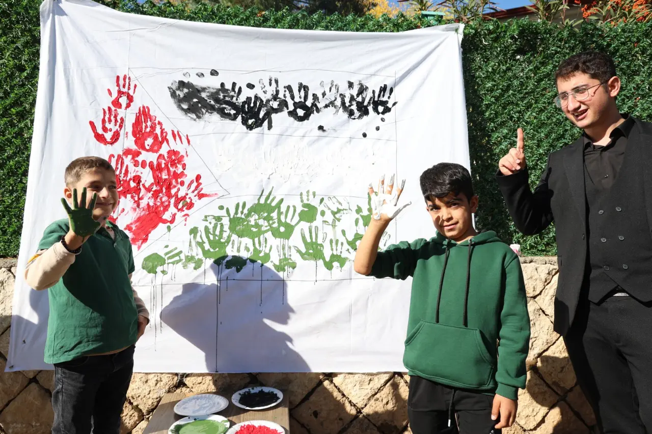 Etkinlikte öğrenciler, Filistin bayrağını simgeleyen bir çalışma ortaya çıkardı. Renklerle boyanmış ellerini panoya bastılar.