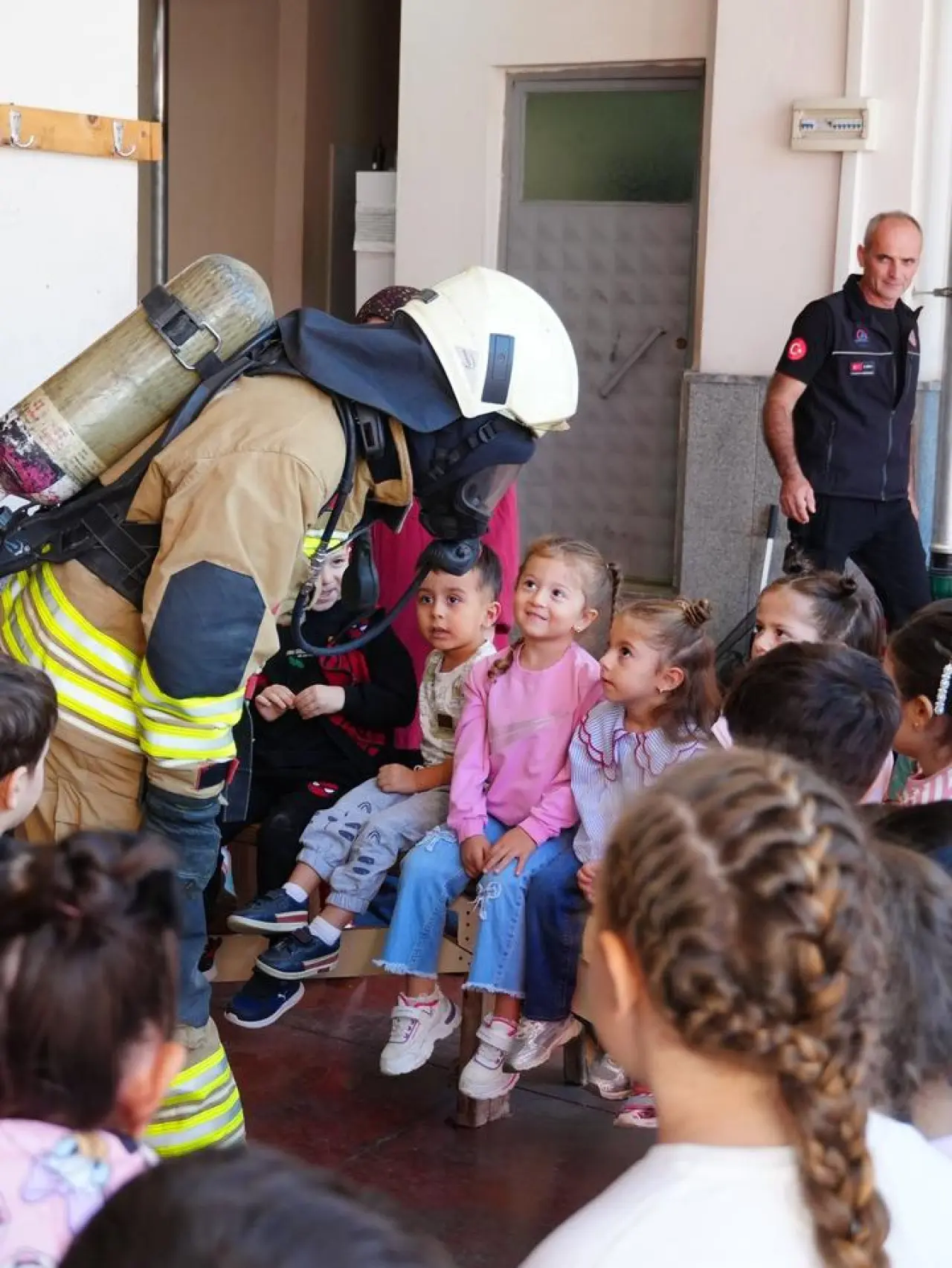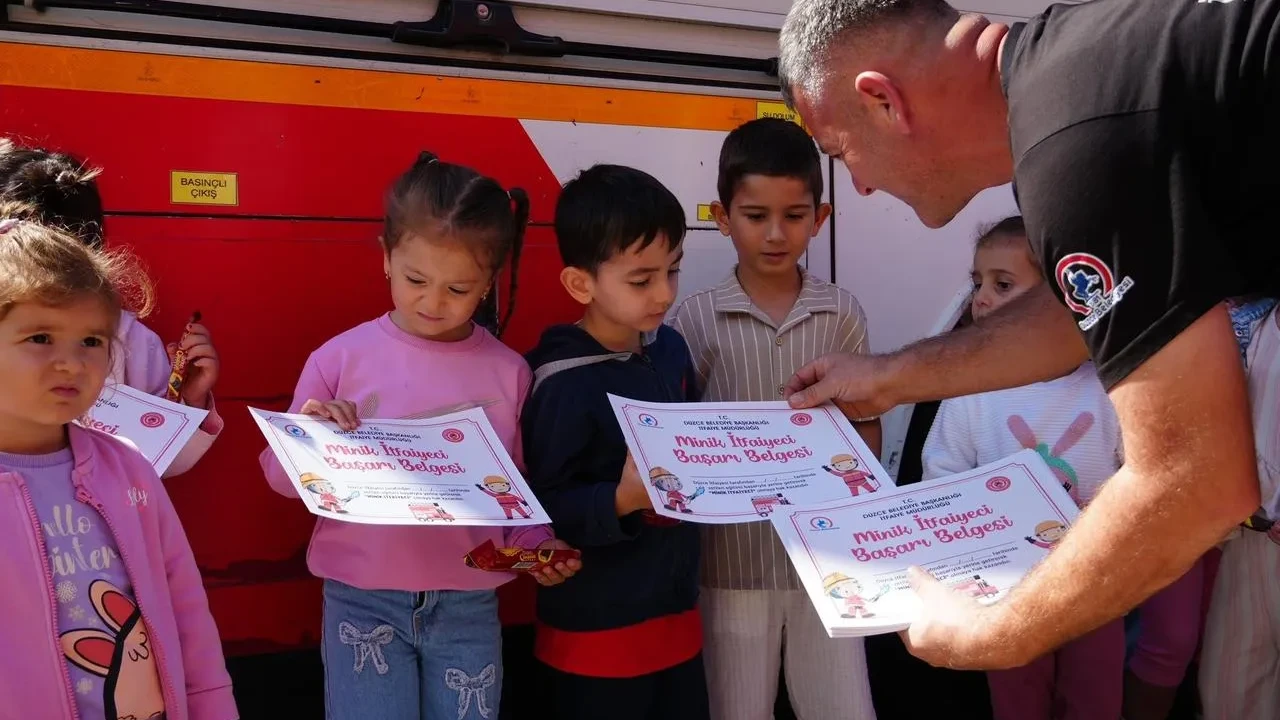 İtfaiye personeli, çocuklara yangın anında yapılması gerekenleri anlattı. Ardından "Minik İtfaiyeci Başarı Belgesi" ve çikolata verildi.