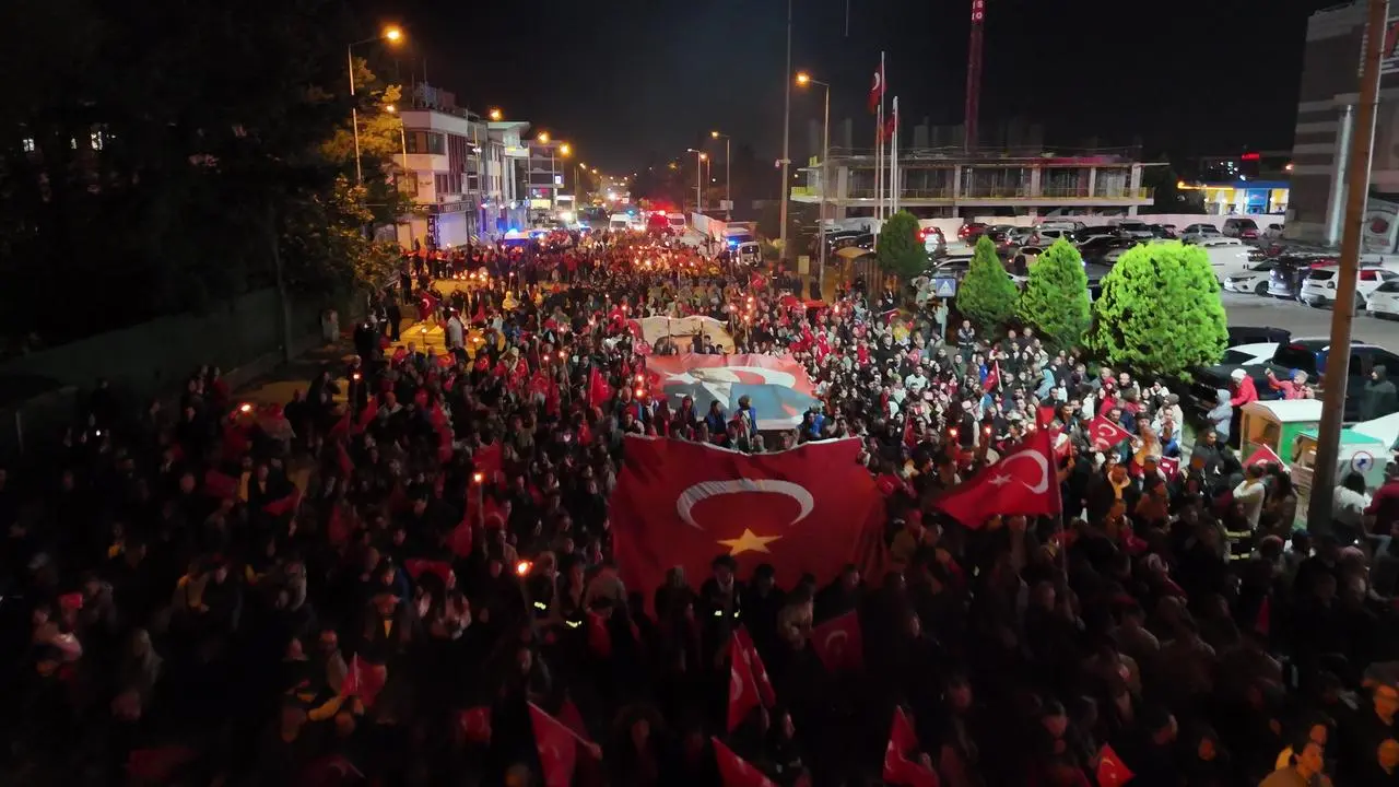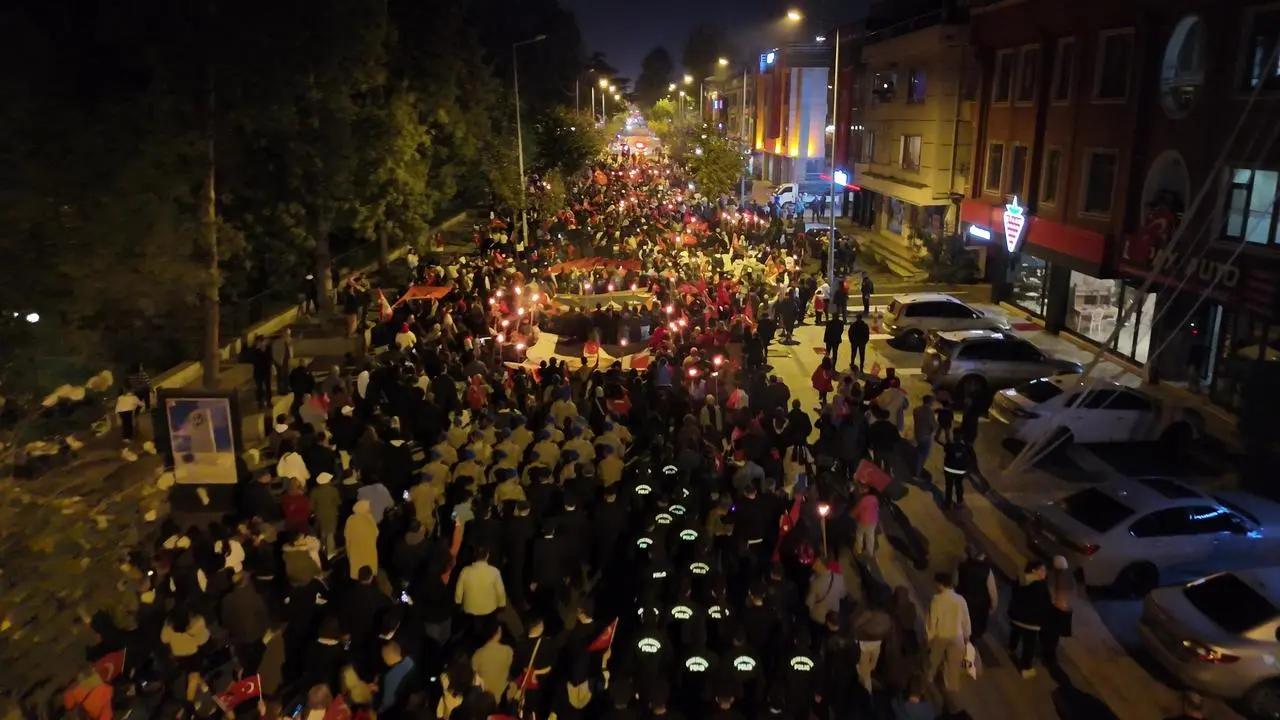 On binlerce Düzceli ellerinde Türk bayrakları ve meşalelerle marşlara eşlik ederek yürüdü. Vali ve protokol üyeleri de yürüyüşe katılarak coşkuya ortak oldu.