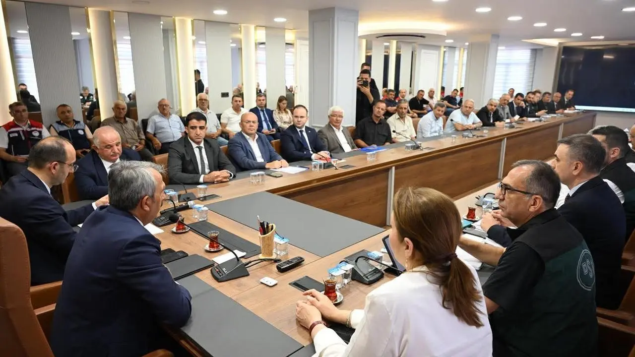 Vali Yunus Sezer ve DSİ Genel Müdürü Mehmet Akif Balta'nın yanı sıra üreticiler de toplantıdaydı. Nehir debilerindeki düşüşün tarıma etkisi değerlendirildi.