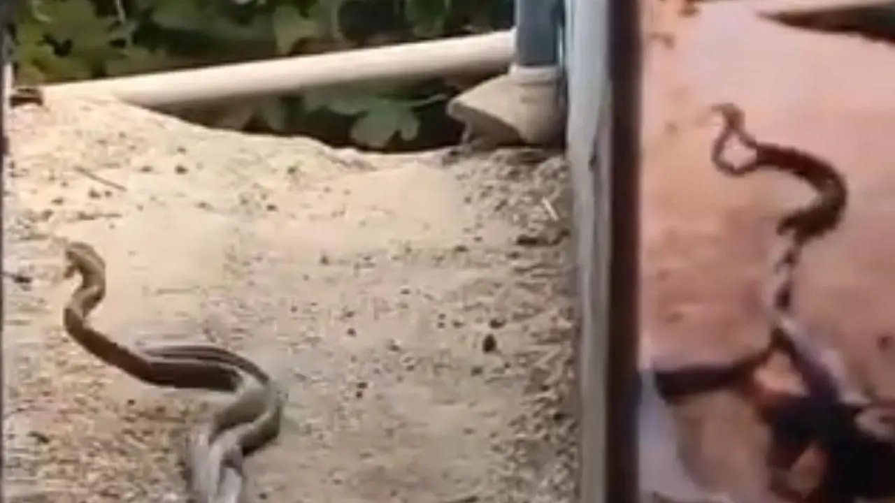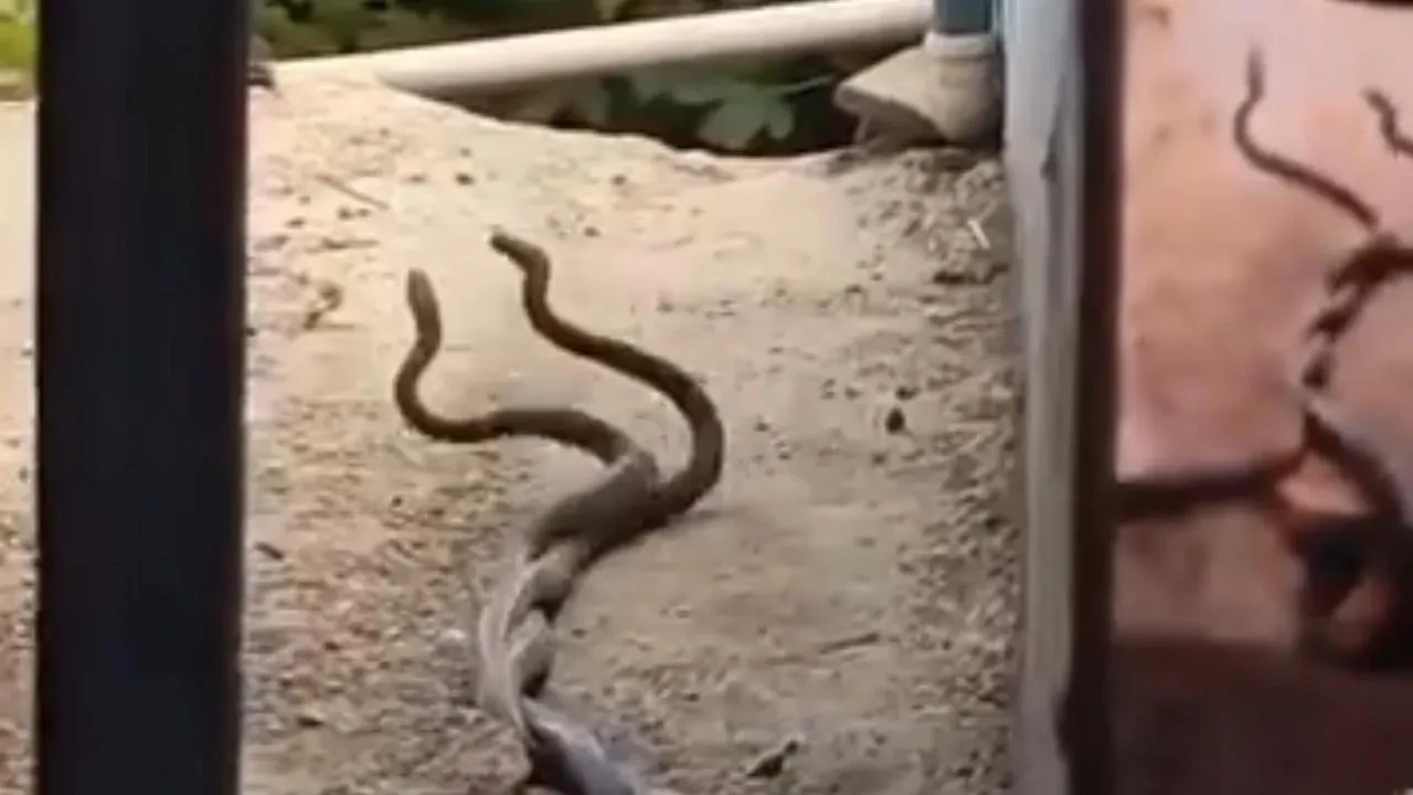Vatandaşlar evin alt katında ani bir hareketlenme fark etti. İki büyük yılan bir çukurdan çıkarak etrafta dolaşmaya başladı.