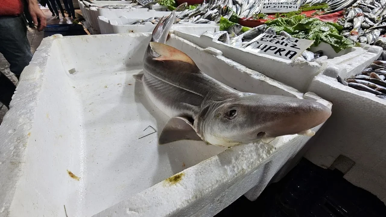 Balıkçı Nihat Baştaş, cam göz köpek balığını satışa sundu. İnsanlar ilk kez gördüklerinde şaşırarak fotoğraf çekiyor ve bu durum ilgiyi artırıyor.