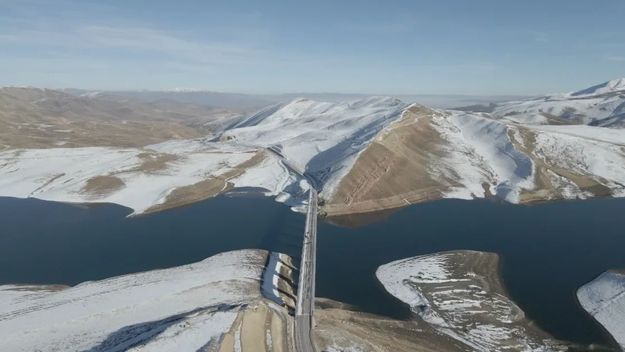 Baraj ve etrafındaki dağlar, beyaz örtüyle kaplanarak muhteşem bir manzara sundu. Köprü, bu buzul güzelliğin ortasında zarif bir hat oluşturdu.