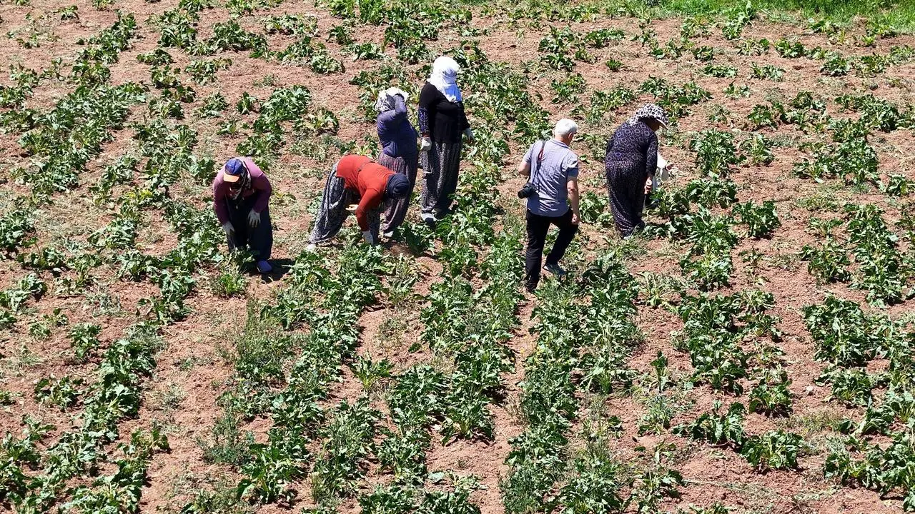 Kadın işçiler sabah 06.00'dan akşam saatlerine kadar tarlada çalışıyor. Sıcaklığın 35-40 dereceyi bulduğu zorlu şartlarda üretim devam ediyor.