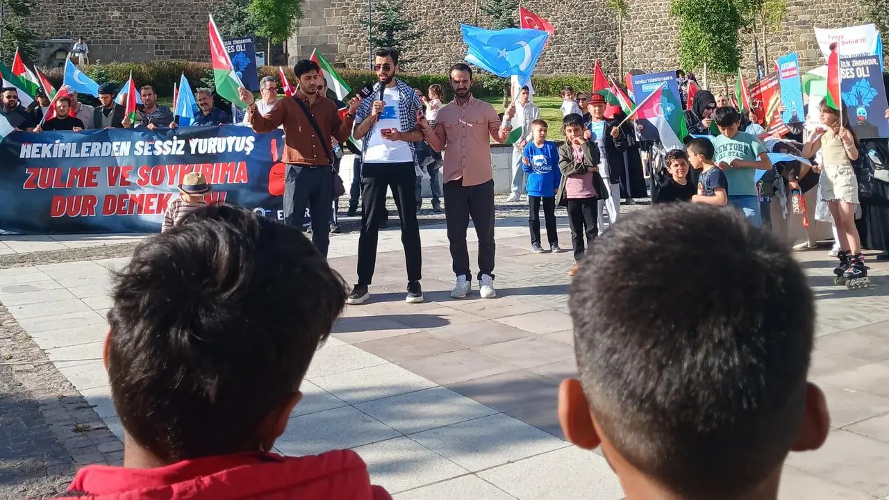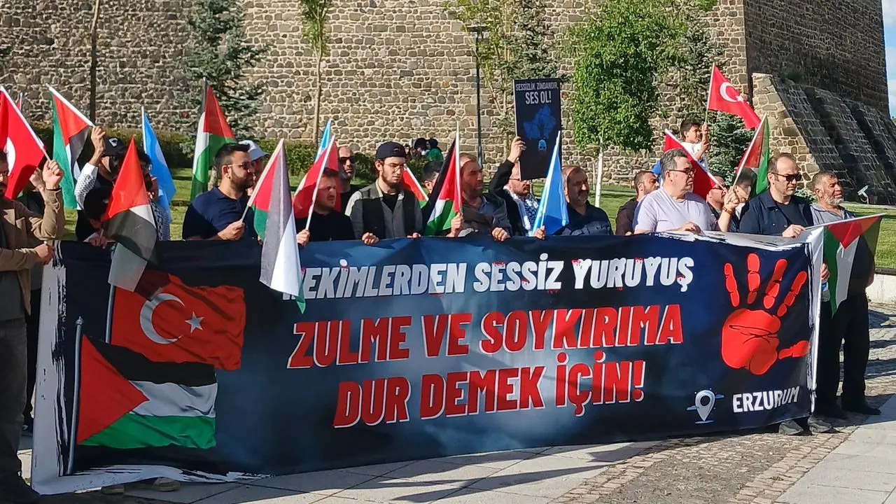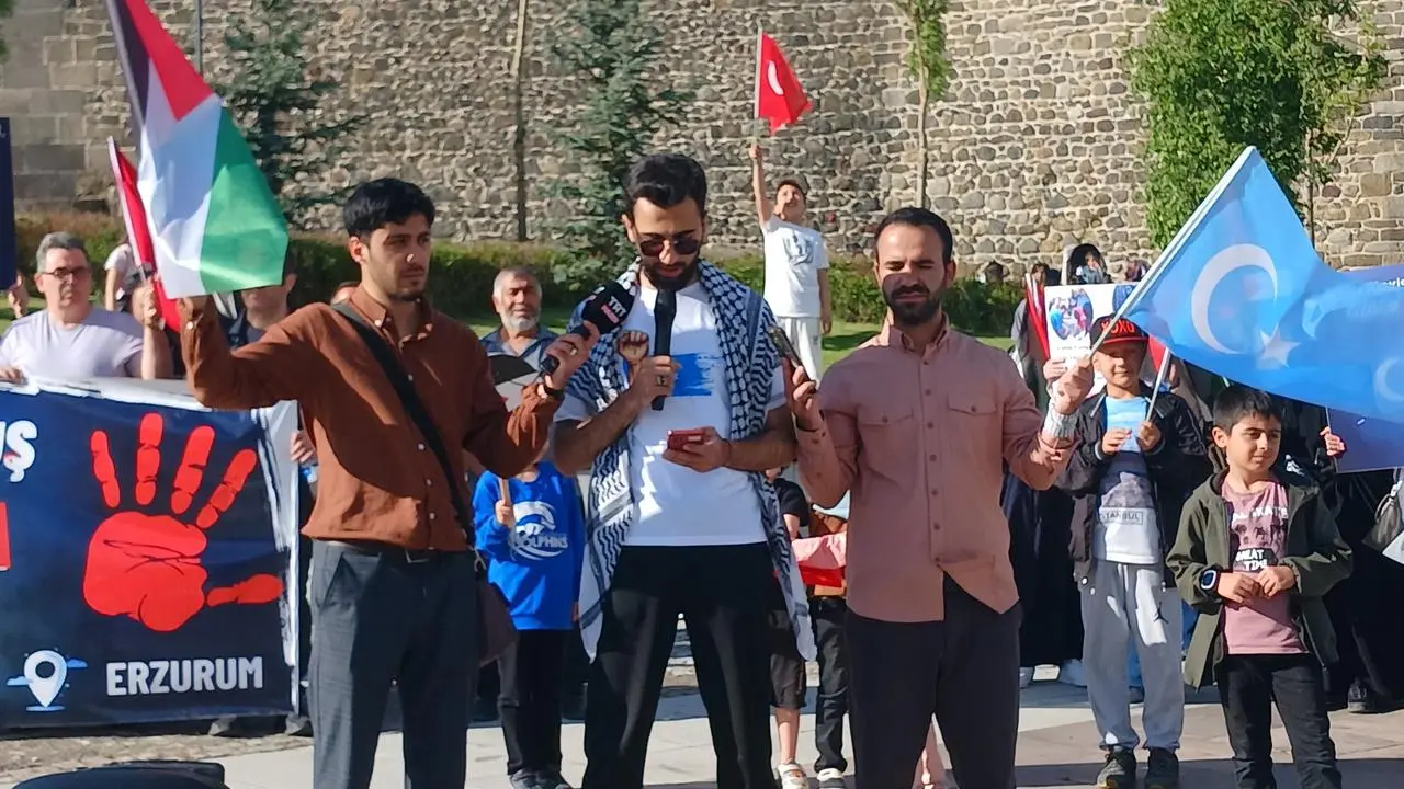 Erzurum Kalesi önünde toplanan grup, zulme karşı seslerini yükseltti. Türk, Filistin ve Doğu Türkistan bayrakları taşıyan protestoculara vatandaşlar destek verdi.