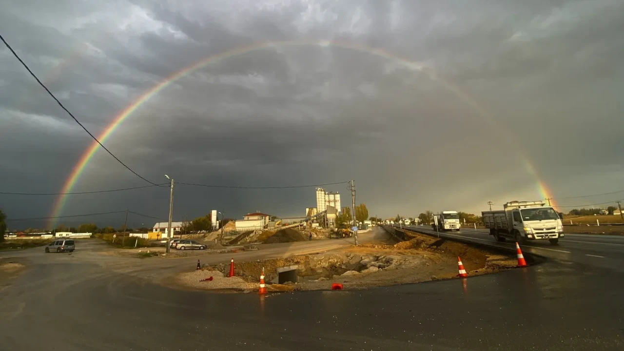 Akşam saatlerinde etkili olan sağanak, ardından gökyüzünü renk cümbüşüne çevirdi. Alpu yolu çevresinde net şekilde görülen bu doğa olayı, vatandaşların ilgisini çekti.