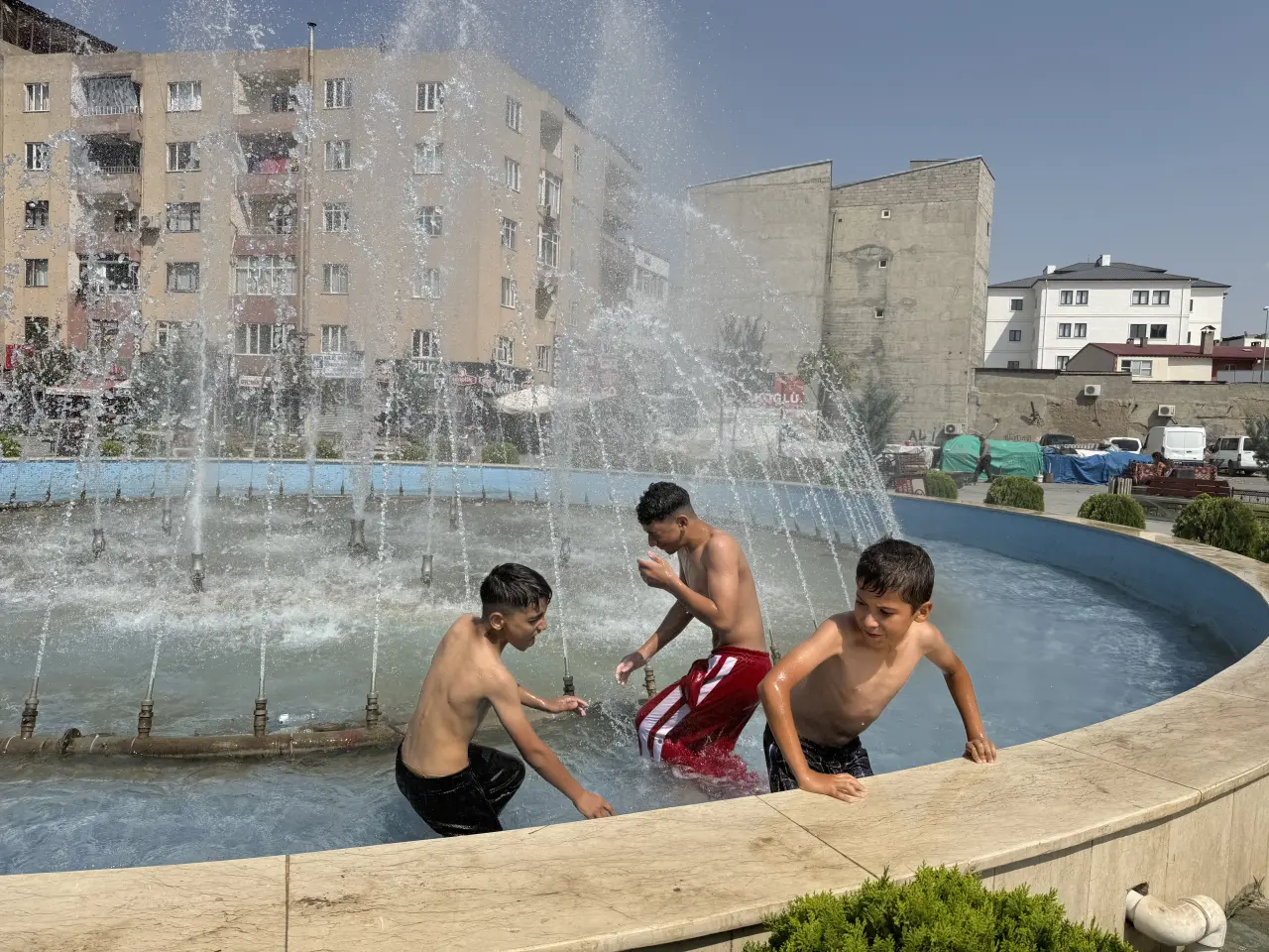 Iğdır'da kavurucu sıcakta çocuklar tehlikeyi göze alarak süs havuzuna girdi.
