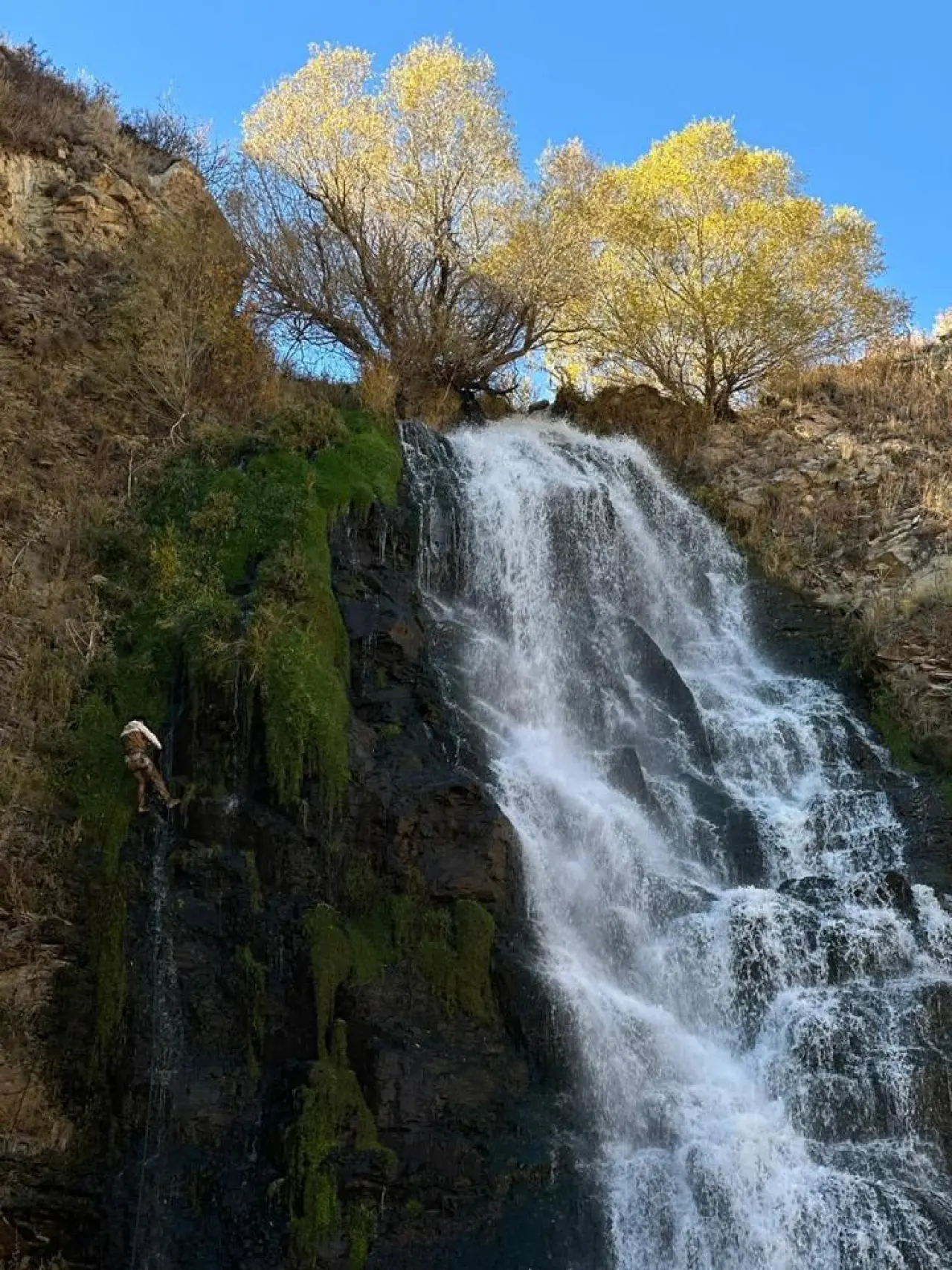 Dağcılar, sonbahar manzarası eşliğinde fotoğraf çekip halay çekti. Üç dağcı, şelaleden ipli iniş yaparak Türk bayrağı açtı.