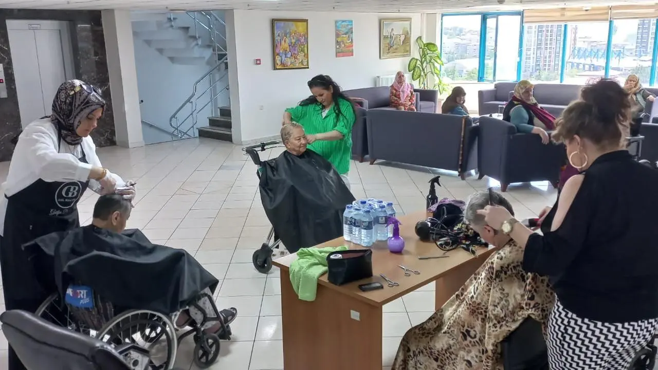 Huzurevinde kalan yaşlı bireylere saç kesimi ve bakım hizmetleri ücretsiz olarak sağlandı. Gönüllü kuaförler, yaşlıların saç ve sakal tıraşlarını özenle gerçekleştirdi.