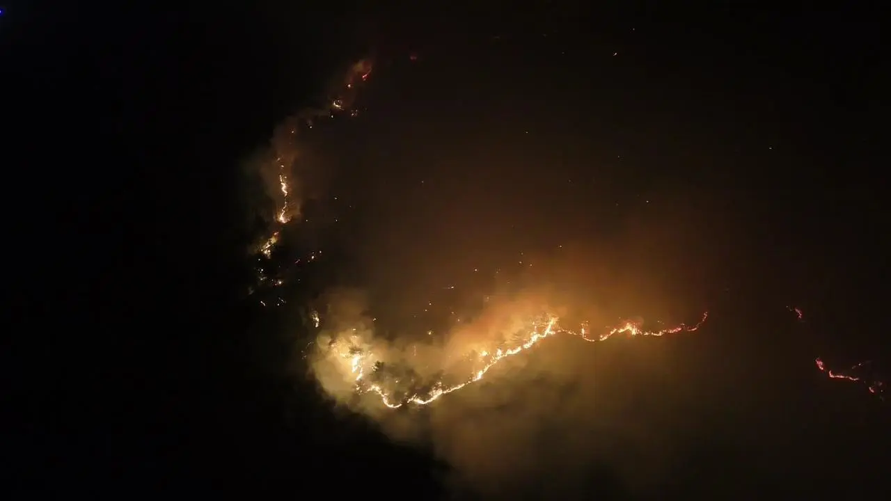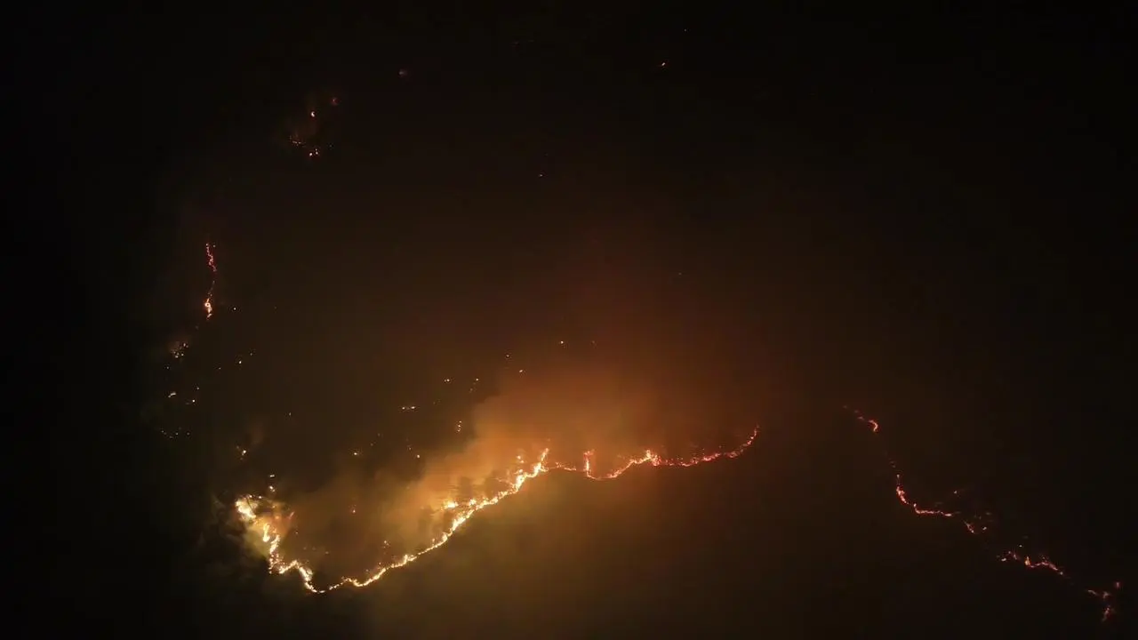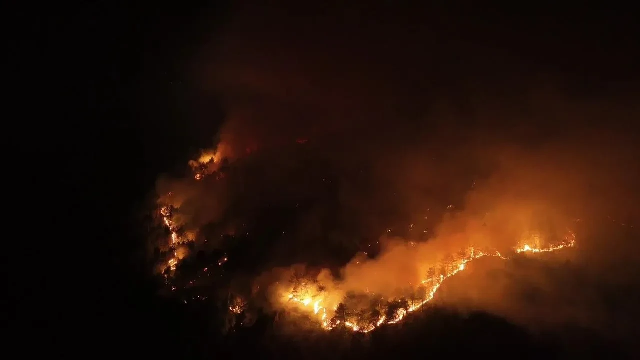 Drone ile görüntülenen yangın, gece boyunca bölgeyi aydınlattı. Görüntüler, yangının büyüklüğünü ve etkisini açıkça gösteriyor.